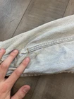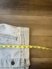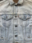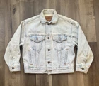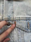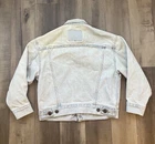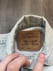 *Small Stain on Sleeve* This is a vintage Levi's women's denim jean jacket in size small, featuring a classic button closure, long sleeves, and a mid-length fit. Made in the USA with 100% cotton outer shell and lining, this jacket has a solid blue color with button accents and pockets. It is a stylish and casual piece perfect for all seasons, showcasing the timeless Levi's Trucker model with a vintage orange tab detail.
