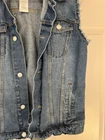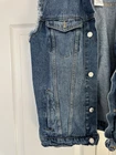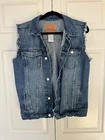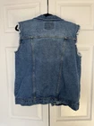 This is a vintage Levi's sleeveless denim jacket in size XL for men. It features a button closure, collared style, and a mid-length design. Made from denim fabric with a solid blue color, it has a classic fit with Levi's logo accents. The jacket has a 90s USA theme and is personalized with a chopped style. Perfect for casual or workwear occasions, it is suitable for various activities like riding, walking, and hiking.