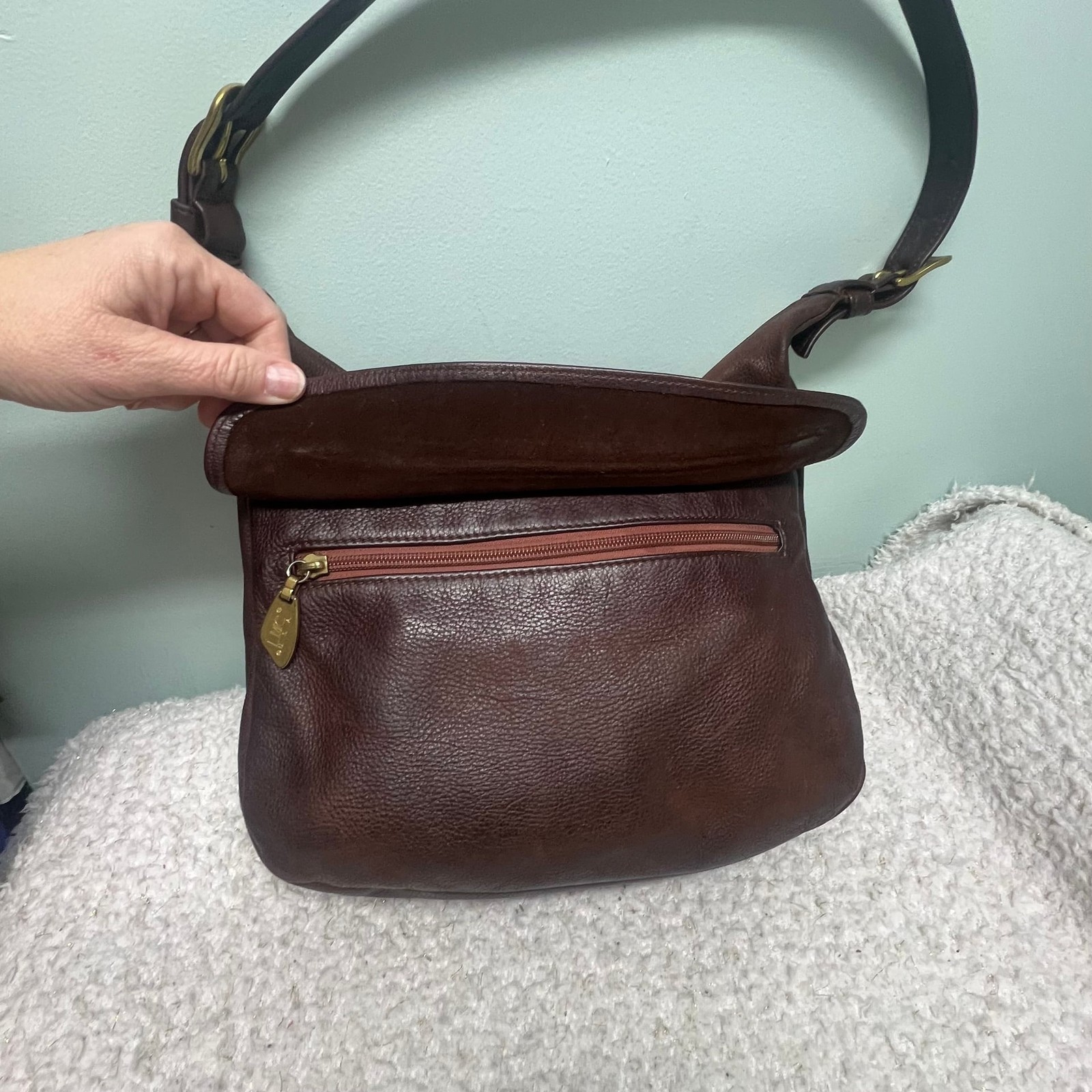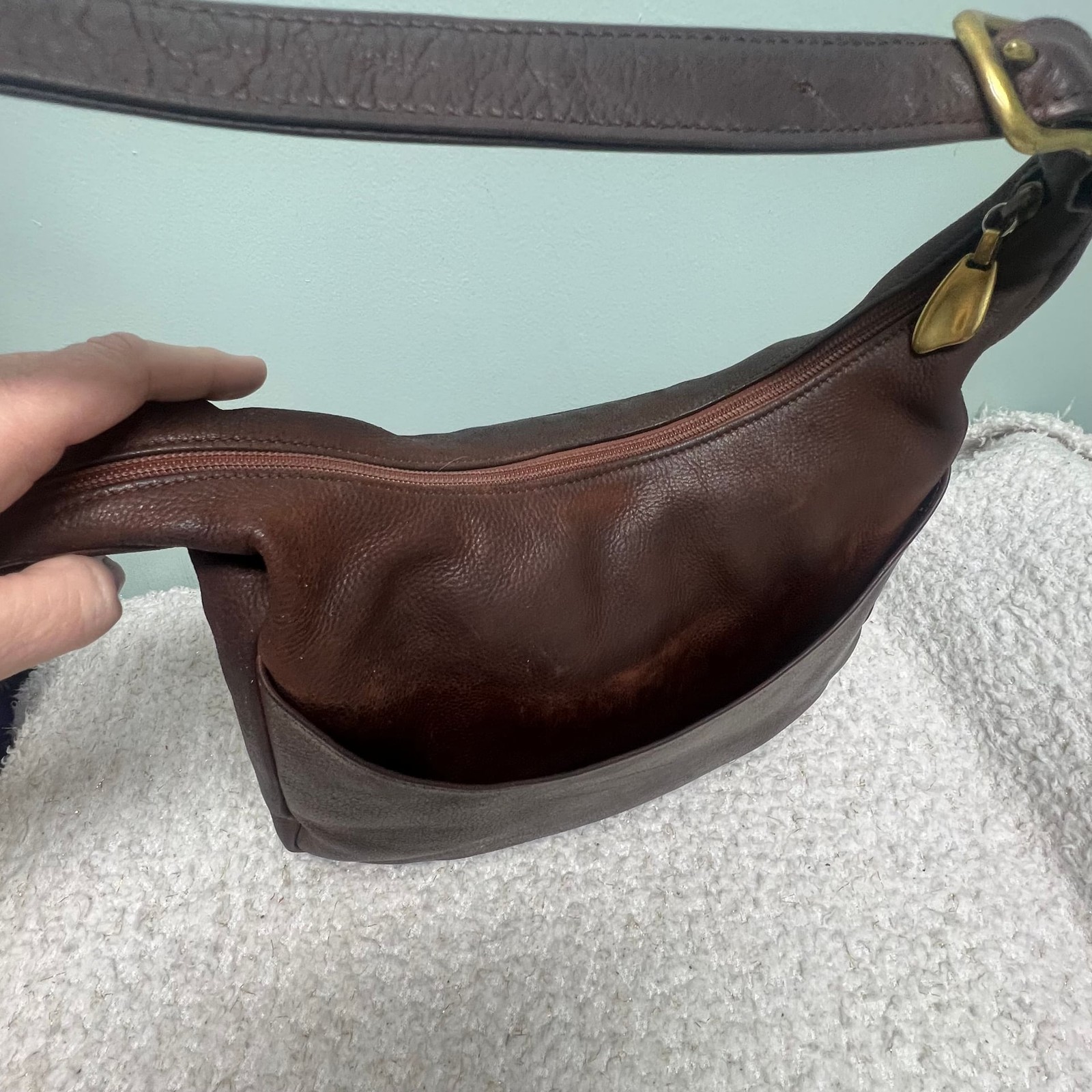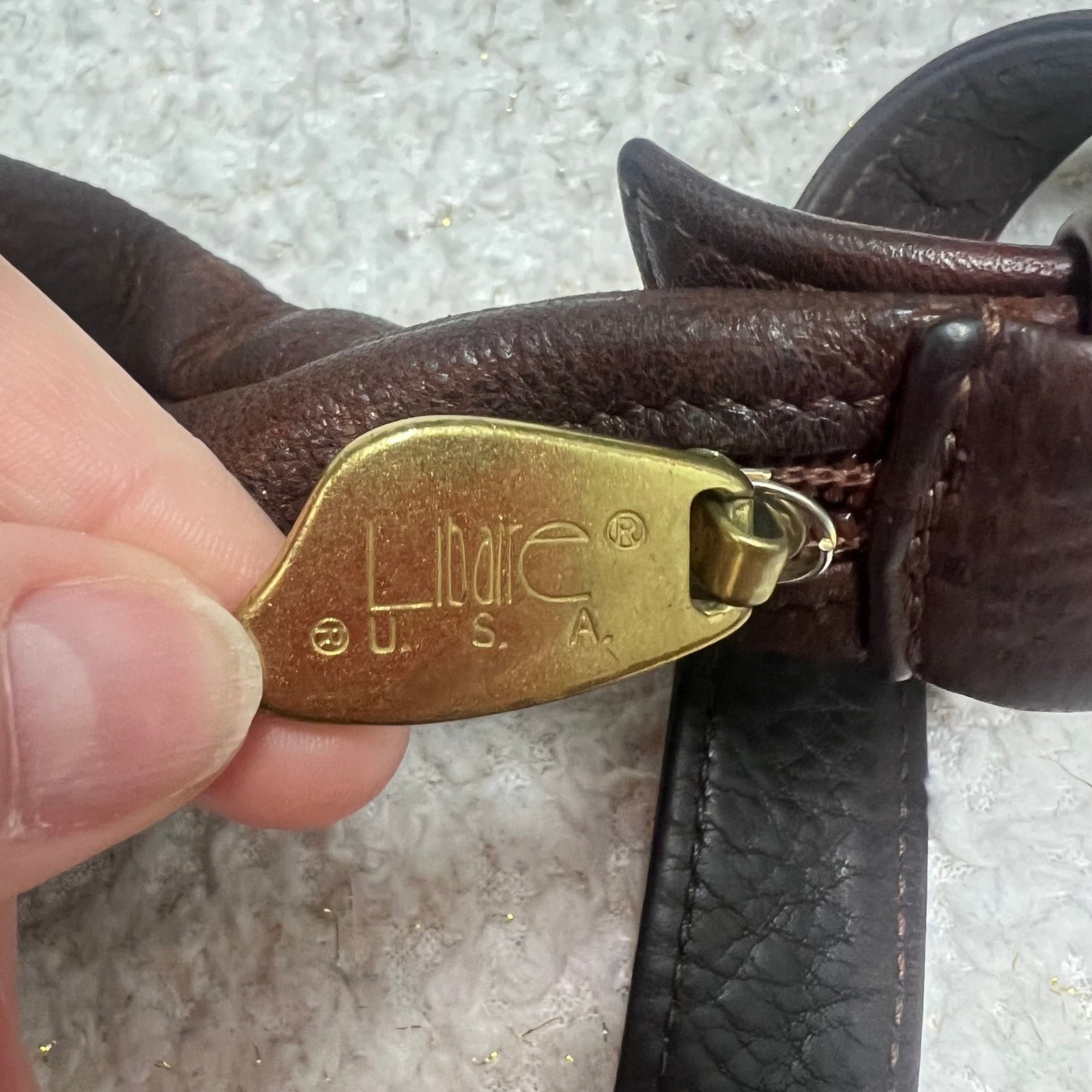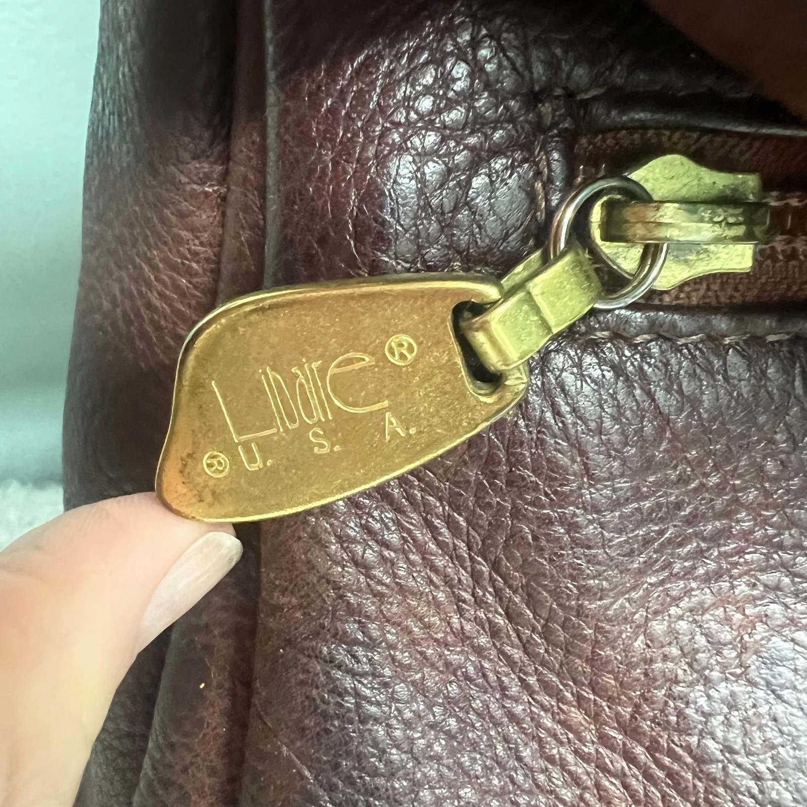 Vintage Libaire Dark Brown Leather Hobo Shoulder Bag, Handcrafted in USA. This high-quality piece features a soft, pebbled leather exterior in a rich espresso brown. I have personally conditioned this bag with Leather CPR. The leather is clean and well hydrated. Details include: - Adjustable shoulder strap with brass-tone hardware. - Top zip closure to keep essentials secure. - Exterior front flap pocket and a back slip pocket for quick access. - Spacious interior lined in a wine-colored fabric with multiple organizational slip pockets and a zip compartment. - Signature Libaire logo gold-tone zipper pulls. Condition: Good vintage pre-owned condition. Shows some gentle wear consistent with age, including slight scuffing on the bottom and corners which adds to its vintage character. No major stains or holes.