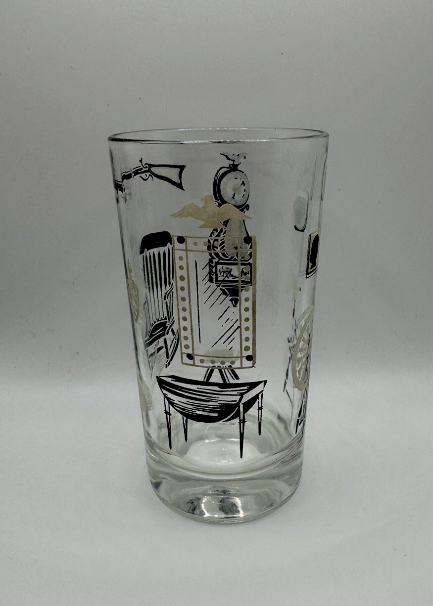 The Libbey Freda Diamond Curio Collection Collins Glass from the 1950s is a vintage barware item with a Mid-Century Modern style. This cylinder-shaped drinkware features a clear glass design with gold, black, and white accents, making it perfect for all occasions. Hand wash only to preserve its originality, this unisex adults' item is a unique addition to any collection, showcasing the theme of MCM furniture in its design.