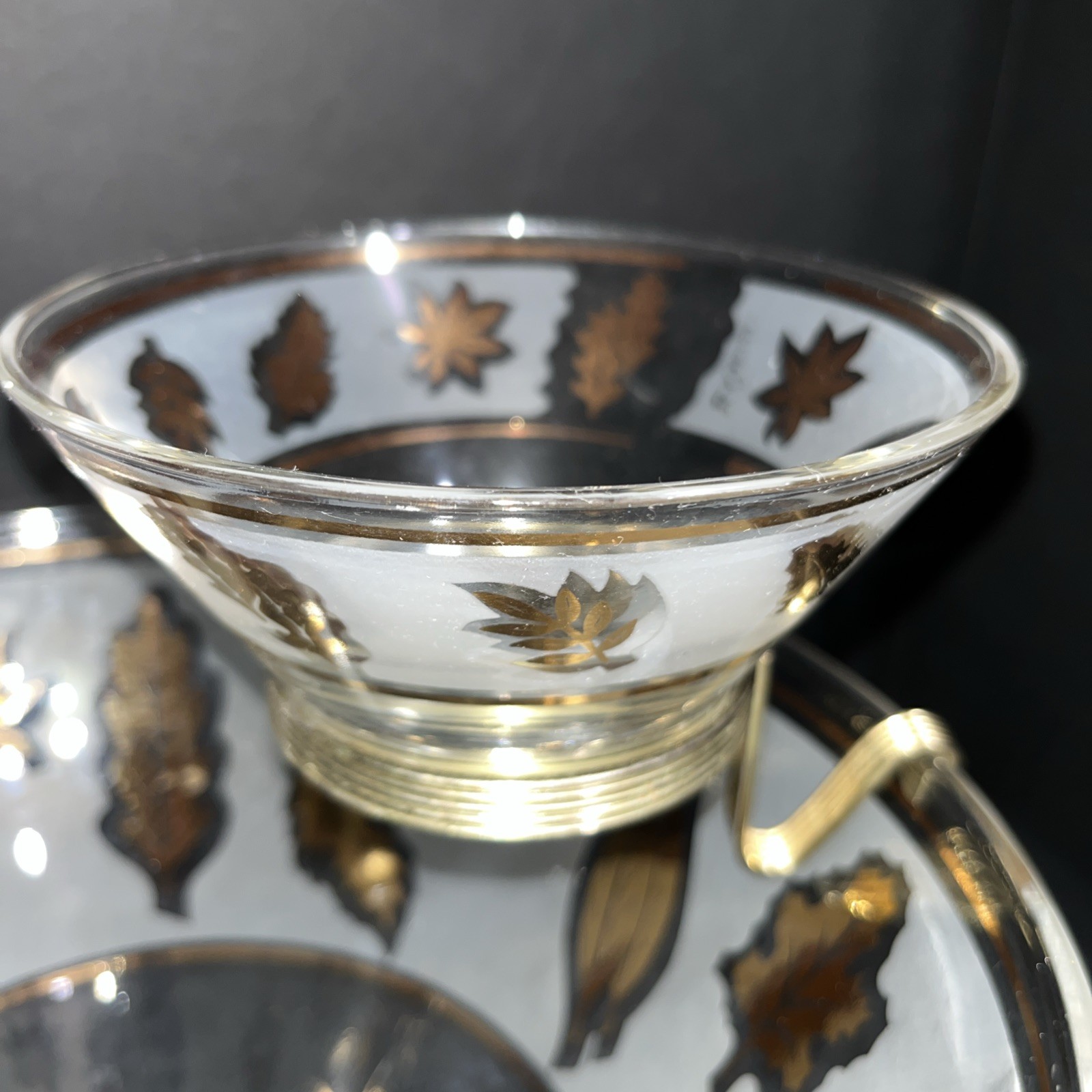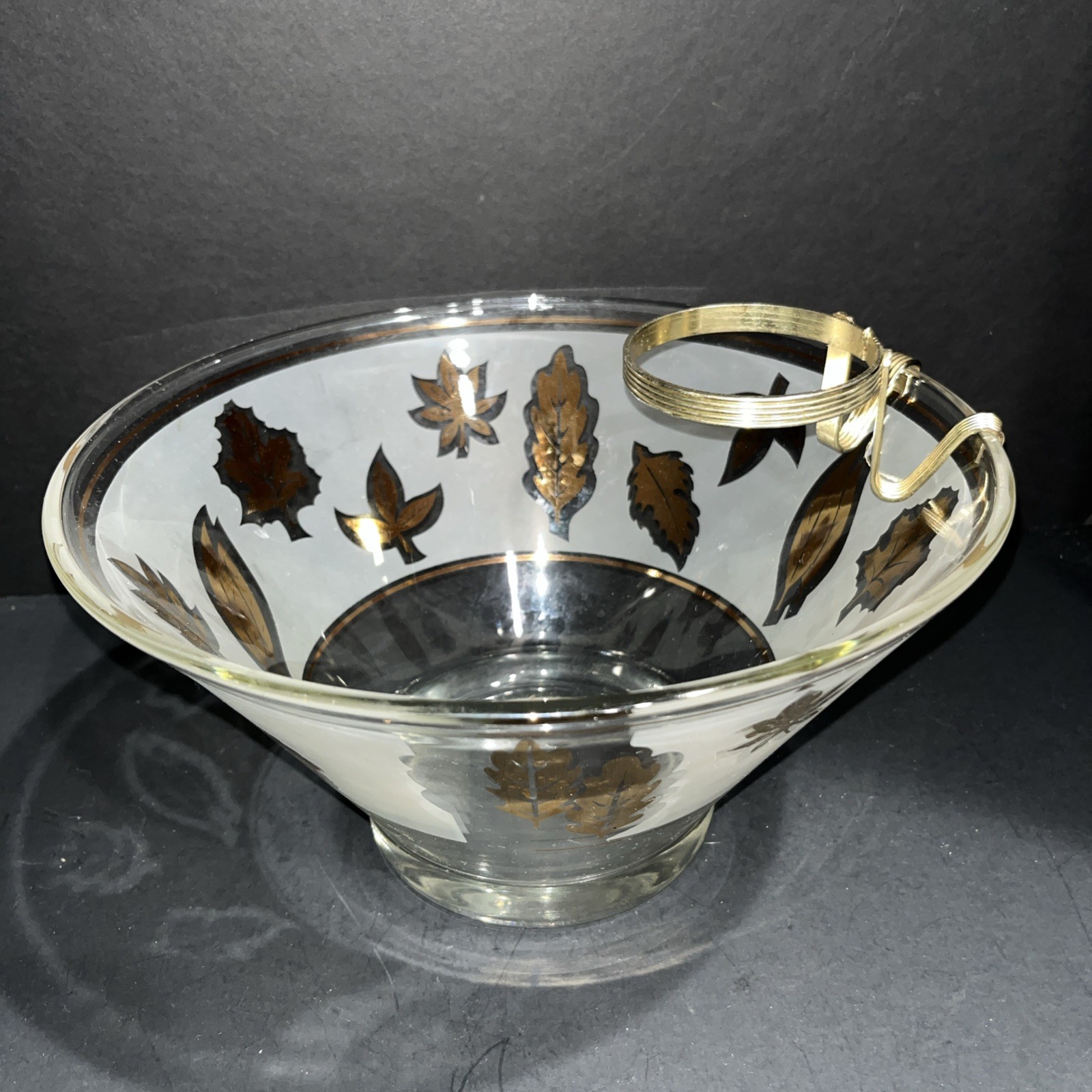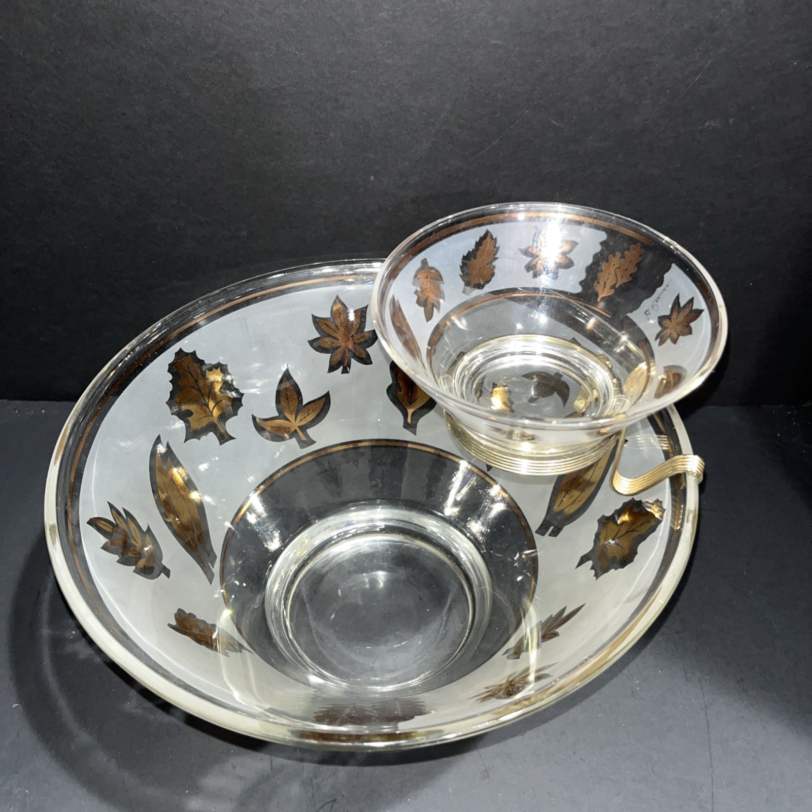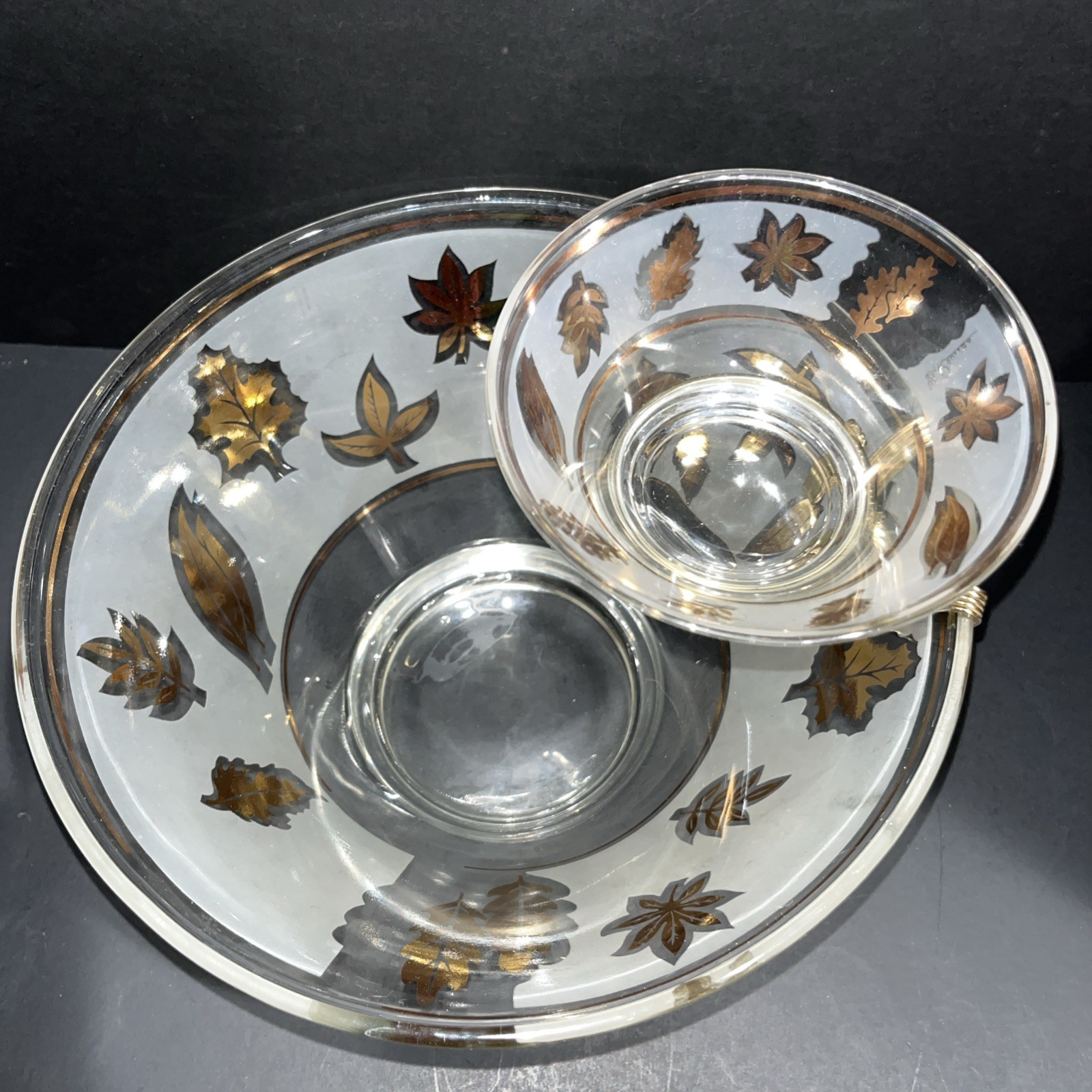 VTG Libbey Large Salad Chip & Dip Bowl Set Cradle Frosted Gold Rose Leaf Pattern. In good condition with no chips or cracks. Please see pictures for condition and measurements. Ships next business day after payment. 😊