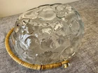Beautiful vintage bowl, great for displaying and/or serving. Oval shaped, clear glass with embossed fruit pattern and rattan handle. Approximate Dimensions: 10” x 8” x 3.5”H