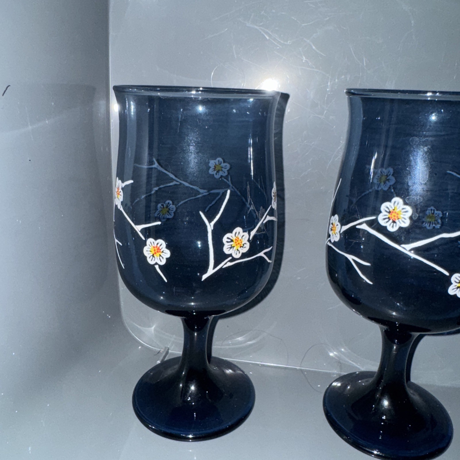 This set of 3 vintage Libbey Smokey Blue Daisy Water Wine Goblets features a beautiful floral pattern in a stylish blue color. Made of glass and with a vintage design from the 1980s, these goblets are perfect for any drinkware collection. The decorative and original pieces are ideal for unisex adults looking to add a touch of retro charm to their table setting.