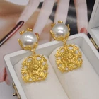 Add a touch of vintage elegance to your style with these stunning French palace style pearl embellished gold pendant clip-on earrings. The earrings feature a lion head design that exudes strength and confidence. The pearl main stone adds a touch of sophistication to the overall look. These yellow gold plated earrings are perfect for any occasion, whether it's an anniversary or a birthday. The dangle/drop style and the beauty, art, & animals make these earrings a must-have for any jewelry collection. The earrings are 2.56 inches in length and are designed to be worn on the lobe. Vintage Lion Head French Palace Style Pearl Gold Pendant Clip On Earrings 2.56" Length 1.18" Width Clip On Gold Plated