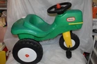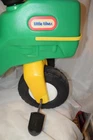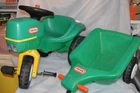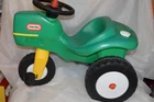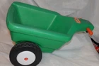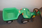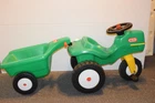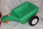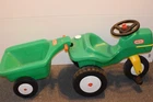 This sale is for a Little Tikes Green Pedal Tractor and Trailer. Item was made in the USA. Item is in g ood used clean condition with nicks, marks, scratches, abrasions and overall storage/age/use wear. The item is in good working order and very sturdy. Hitch, handles, horn, gas cap, steering wheel and wheels all work like they should. It rolls easy and straight. You do not find these often and they are HTF. Front wheel is solid, most of these wear out and have a hole/crack in front wheel. This is one of the nicer sets that I have found lately. The flaws that I noticed are; gas cap retainer strap is broken/cut off, small white dots on back of tractor like spray paint overspray, discoloration/abrasions on back of tractor, one large tractor white wheel cover is a little loose, staining on one underside of trailer, trailer has lots on wear in bed from use. I tried to supply pictures of all these areas. Item will ship disassembled and front wheel and steering wheel assembly will need to attached using one screw. Pedals will need to be attached using four screws. Item is large and heavy. I find that UPS is the best/cheapest carrier. shipping price has been discounted from retail price of box size. I ship within one day of payment and use tracking/ins. I am Top Rated