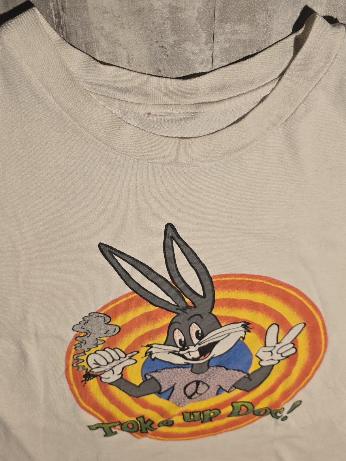 (21.5" X 29", has a stitched repair spot on lower back right) Embrace the nostalgia with this Looney Tunes Bugs Bunny Roger Rabbit Weed vintage T-shirt, a quintessential piece for collectors and fans alike. The classic white cotton tee features a vibrant graphic print that captures the essence of beloved characters in a retro vibe. Tailored for a comfortable fit, this large, single-stitch T-shirt boasts short sleeves and a traditional crew neck. Proudly made in the United States, this T-shirt encapsulates a variety of themes, including bohemian, hippie, and 90s nostalgia. Its unique blend of humor and timeless appeal makes it a perfect addition to any wardrobe, offering a touch of the quirky and the classic. Whether you're showing off your love for Looney Tunes or simply appreciate a well-made vintage garment, this tee is sure to become a cherished item in your collection.
