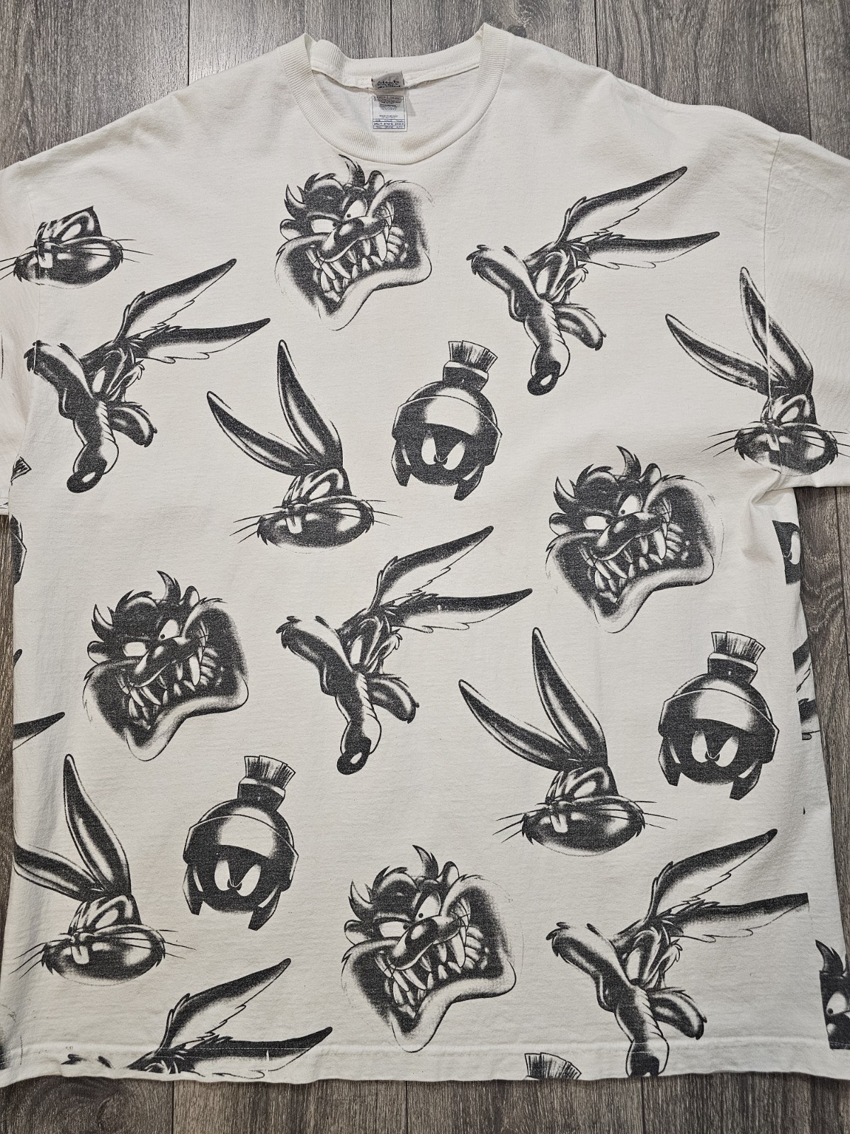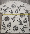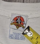The product is a vintage Looney Tunes shirt featuring iconic characters such as Bugs Bunny, Tasmanian Devil, and Willie. This crew neck T-shirt in size 3XL-Tall is a knit fabric with a white color and all-over print graphic. Made in the 1990s in the United States, this shirt is a double-sided, easy-care garment suitable for all seasons. It is part of the Warner Bros character family and has a regular fit, making it a nostalgic and collectible piece for fans of classic cartoons and pop culture icons.