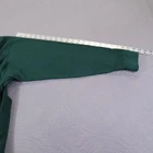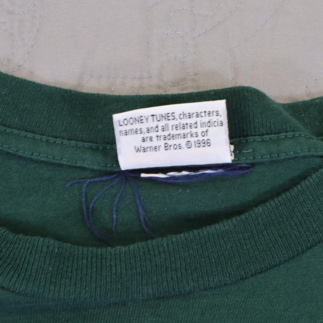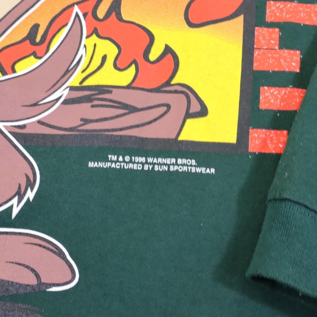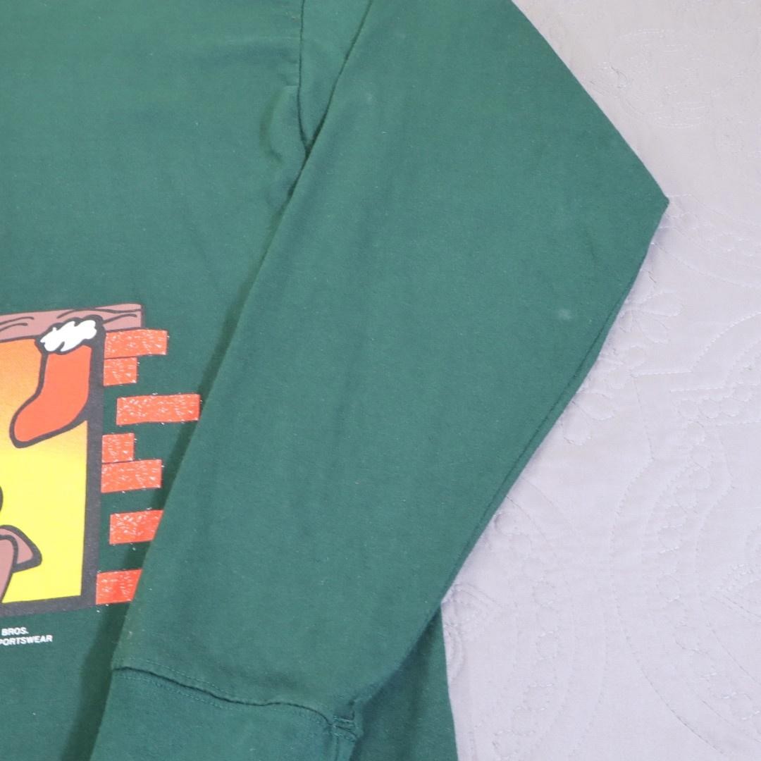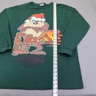 Brand/Franchise: Looney Tunes / Warner Bros. Character: Taz (Tasmanian Devil) in Santa hat holiday graphic. Front text: "WHEN IS ST. NICK GONNA GET HERE?" with fireplace scene. Tag: An Official LOONEY TUNES Product. Print detail: "TM & © 1996 WARNER BROS. MANUFACTURED BY SUN SPORTSWEAR" on front graphic. Color/Style: Dark green crewneck long sleeve graphic shirt. Gender/Size: Mens Extra Large (estimated from fit in photos). Era: 1996 production; classic 90s Looney Tunes holiday piece. Notes: No UPC/EAN or style code visible on tags.