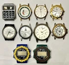 Lot 10 Quartz Watches , Spare Parts ,various brands ,various materials . Not working for parts only . no straps Micronta phone memory radio shack Miyota golf watch Seiko quartz Timex indiglo quartz no case back Swatch swiss missing battery cover TMC The Millionaire's Club Analog Watch no case back Guess indiglo no case back Geneva missing face glass Two lifelong Watches shows age/wear/scratches , sold as is not working for spare parts / parts only . Please see photos and make your determination of Condition