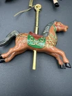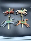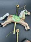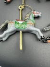 Add some charm to your Christmas tree with this vintage lot of 4 carousel horse ornaments. These small, colorful horses are perfect for any holiday occasion and will bring a touch of nostalgia to your decor. The set includes 4 hanging ornaments made of hard plastic and features intricate details that make them truly unique. Each ornament is shaped like a horse from a carousel and has a height of 4 inches. They are perfect for collectors of antique ornaments or for anyone who loves horses. These ornaments are not only beautiful but also durable, ensuring that they will last for years to come. A couple of them you can see where they reglued.