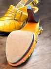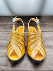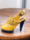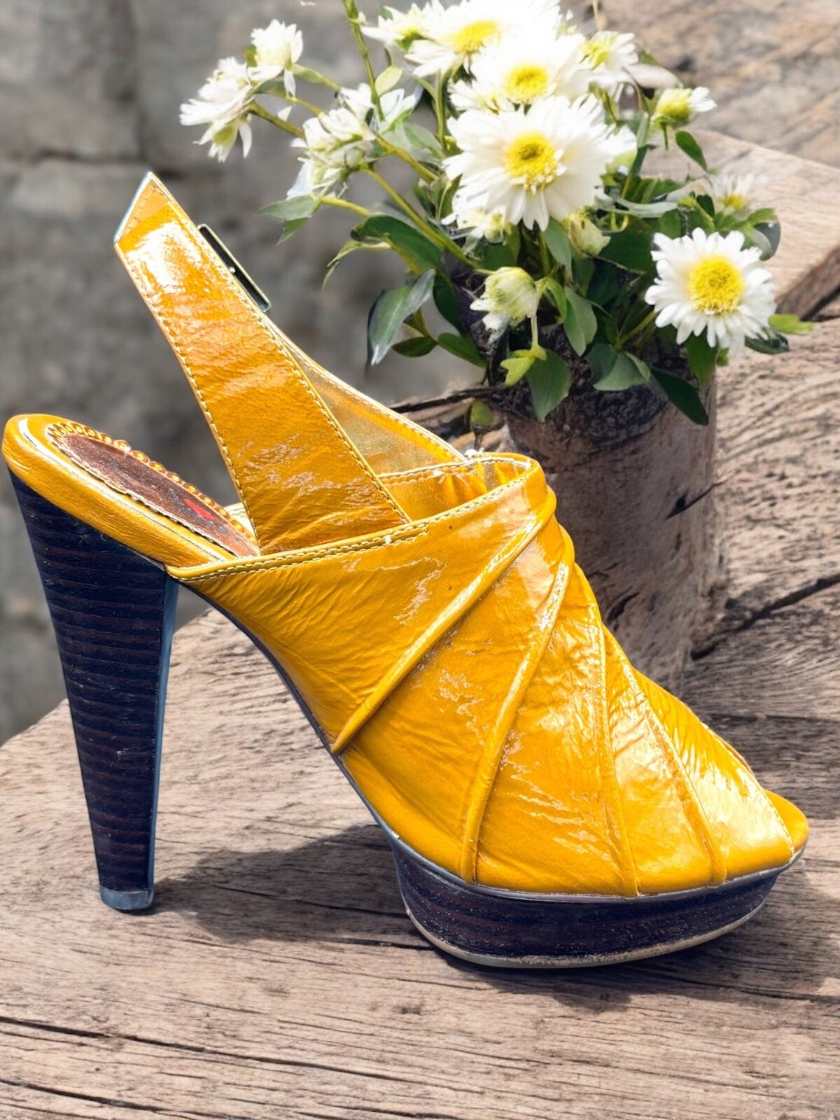 Vintage Luchiny Slingbacks with Buckle and Wood Heel Size 5B Tan Leather These are in very good condition. Extremely Light wear to bottoms. There are a few nicks to the heel , Please see pictures. I did picture a few tiny imperfections on the uppers, very tiny spots . 5" Heels. These are a orange tan more of the warm tone to the tan.