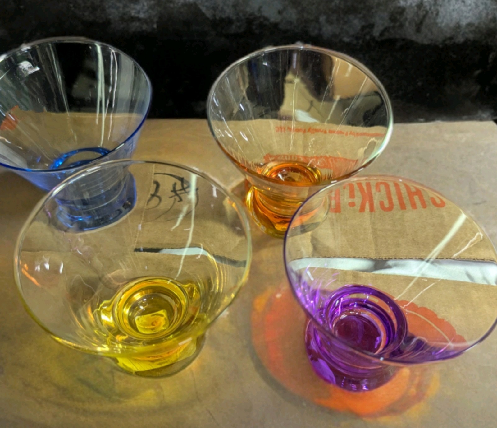 This set of 5 vintage atomic martini glasses features a mid-century modern design with a weighted base, making them perfect for serving your favorite cocktails. The set includes 4 different color glasses, adding a fun and colorful touch to your drinkware collection. Each glass is designed specifically for cocktails, making them a stylish and practical addition to any home bar or kitchen.