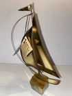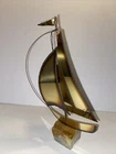 This vintage mid-century modern figurine and statue set features a bronze color metal sculpture of a sailboat, hand-signed by the artist Mario Jason. The piece is an original, created after 1940 and showcases a nautical style that is perfect for any collection or display. The sculpture is made of brass and onyx, adding to its unique and valuable materials.
