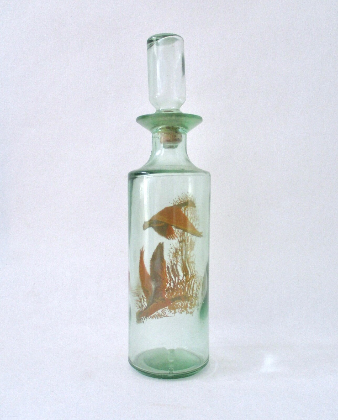 Groovy vintage mid century green glass Fitzgerald whisky decanter bottle with stopper. Features orange and brown flying geese graphic on one side. Bottle is empty and has no stickers. APPROXIMATE MEASUREMENTS Overall height: 12.5" Diameter: 3" CONDITION Excellent vintage condition, no chips or cracks.