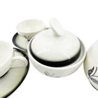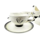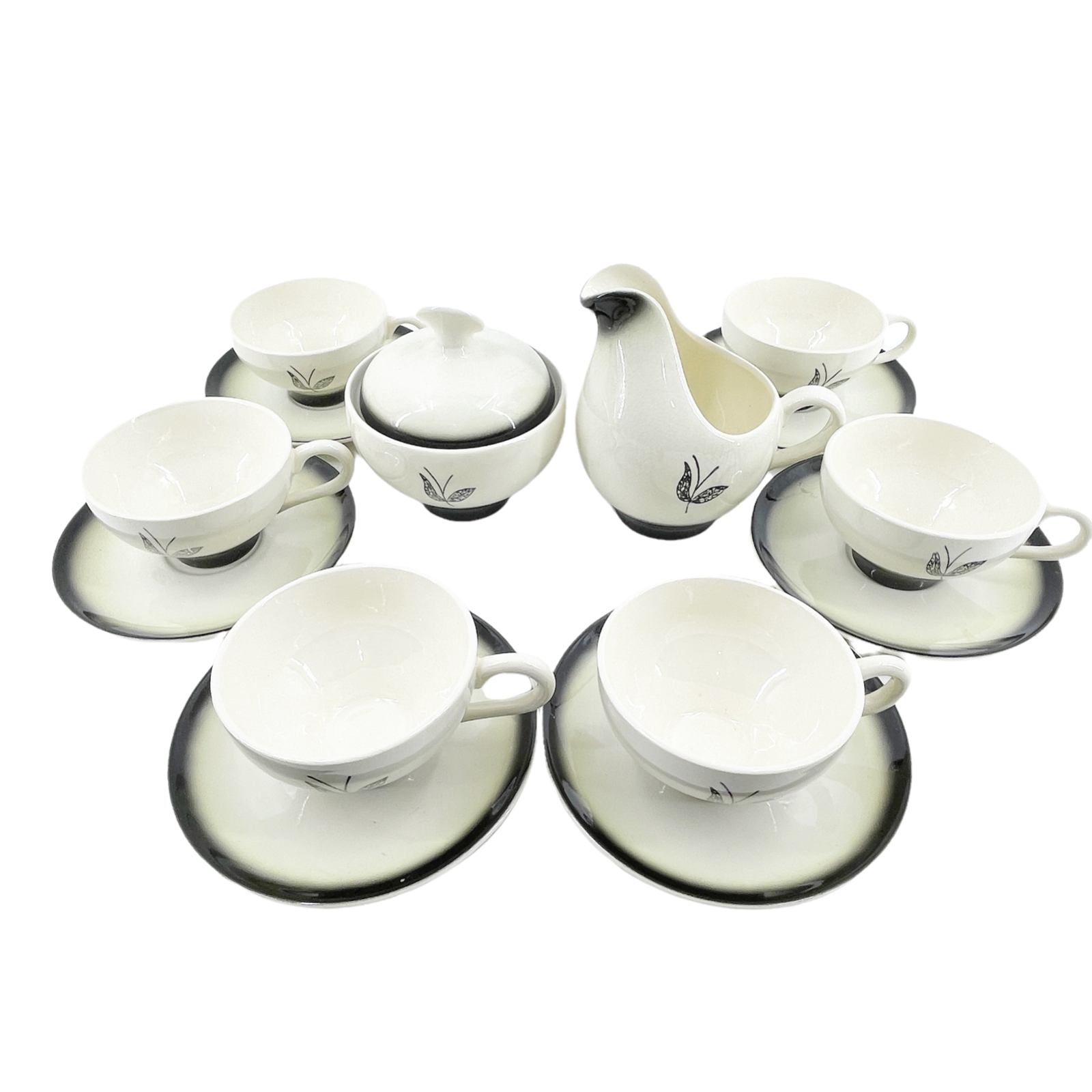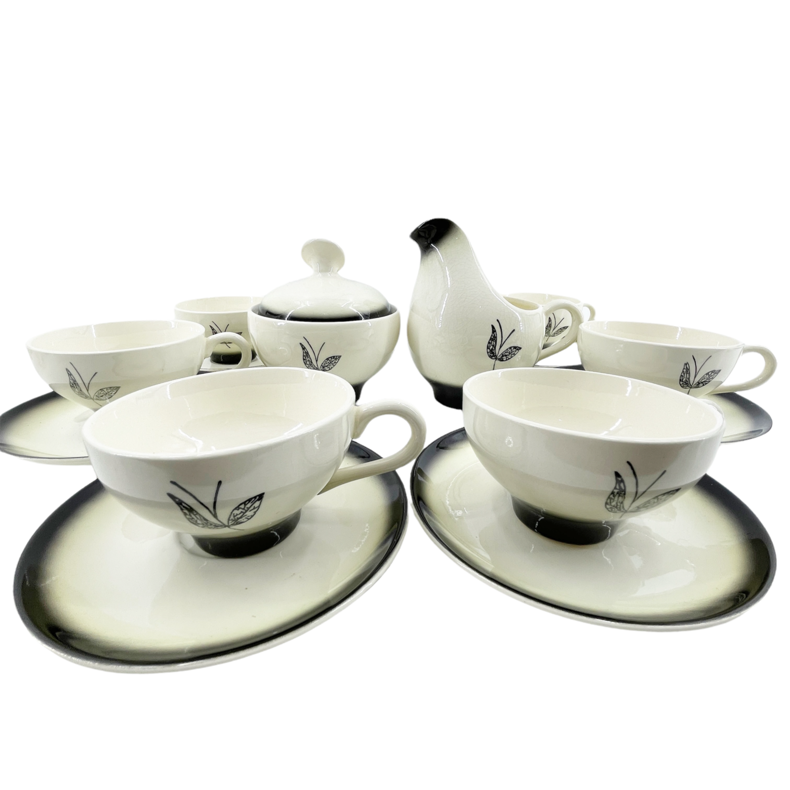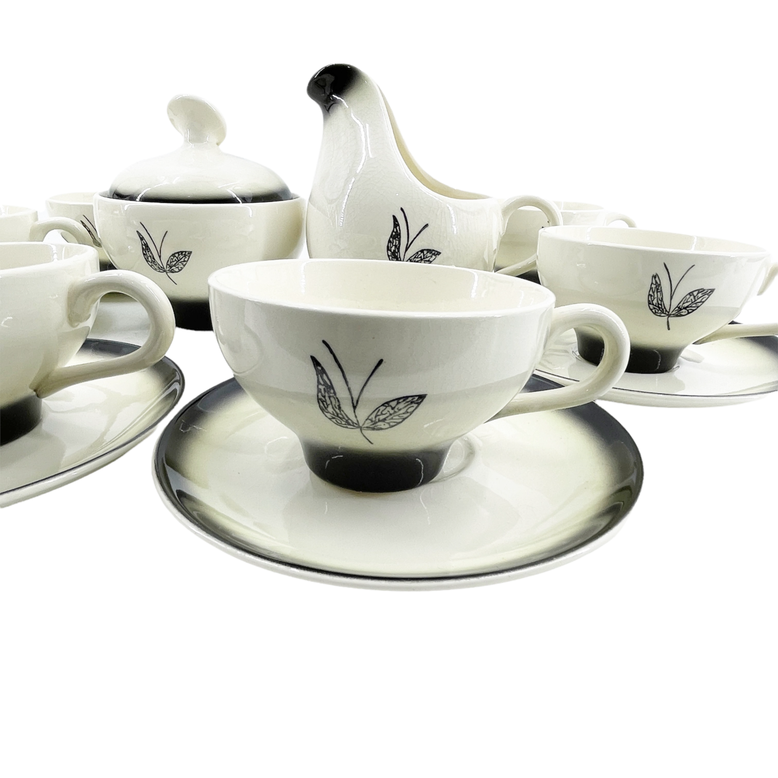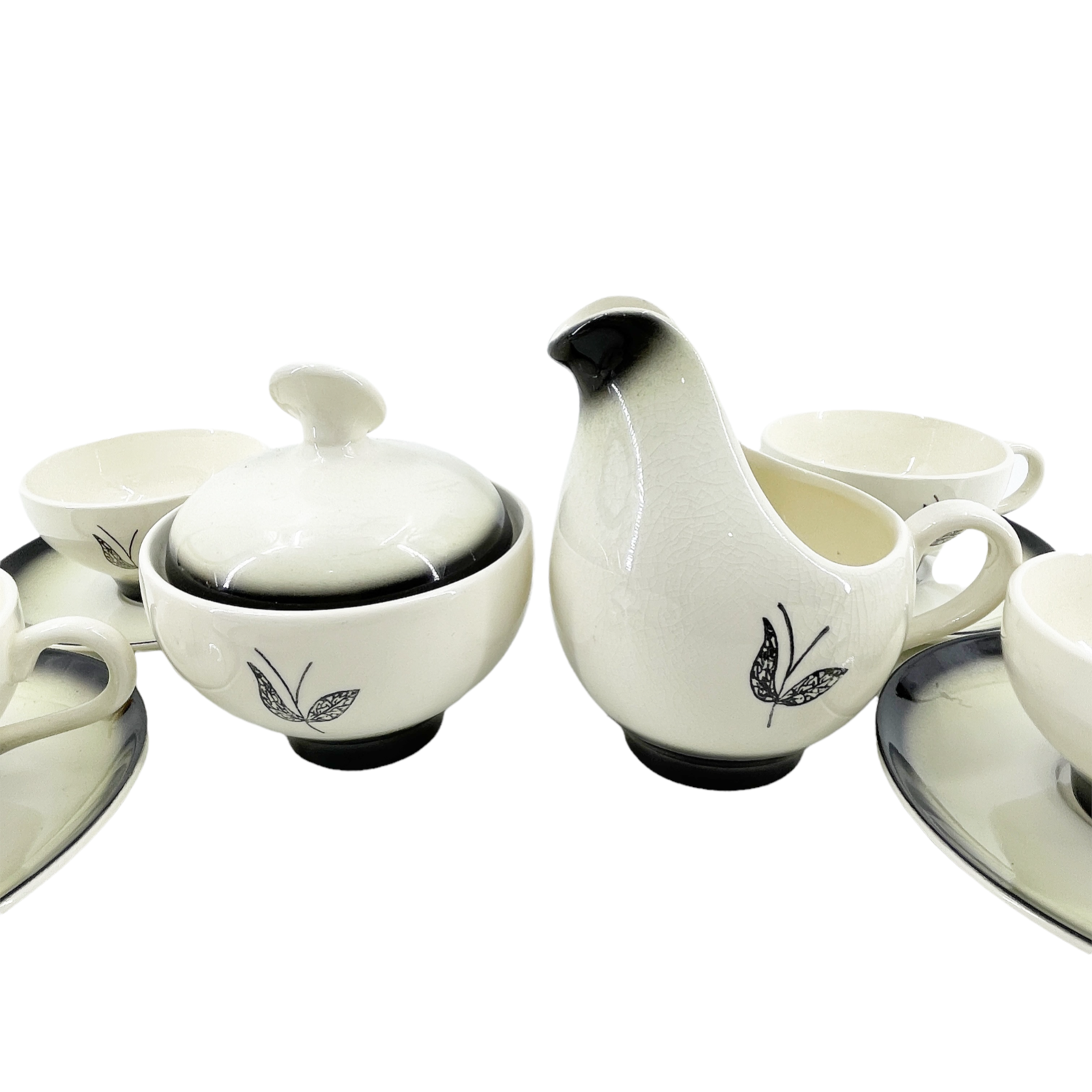 Vintage MCM Stetson Coffee Tea Set 15 Pcs Sugar Creamer Pitcher 6 Cups & Saucers Made in USA. Set includes 15 pieces: Creamer pitcher - 4" diameter and 5 1/2" tall to tip of spout. Sugar bowl and lid - 4 1/2" diameter and 5" tall to tip of finial. 6 saucers - 6" diameter. 6 cups - 3 3/4" diameter at top rim and 2 1/4" tall. Marked on bottom "MADE IN USA" Gorgeous mid-century modern set!