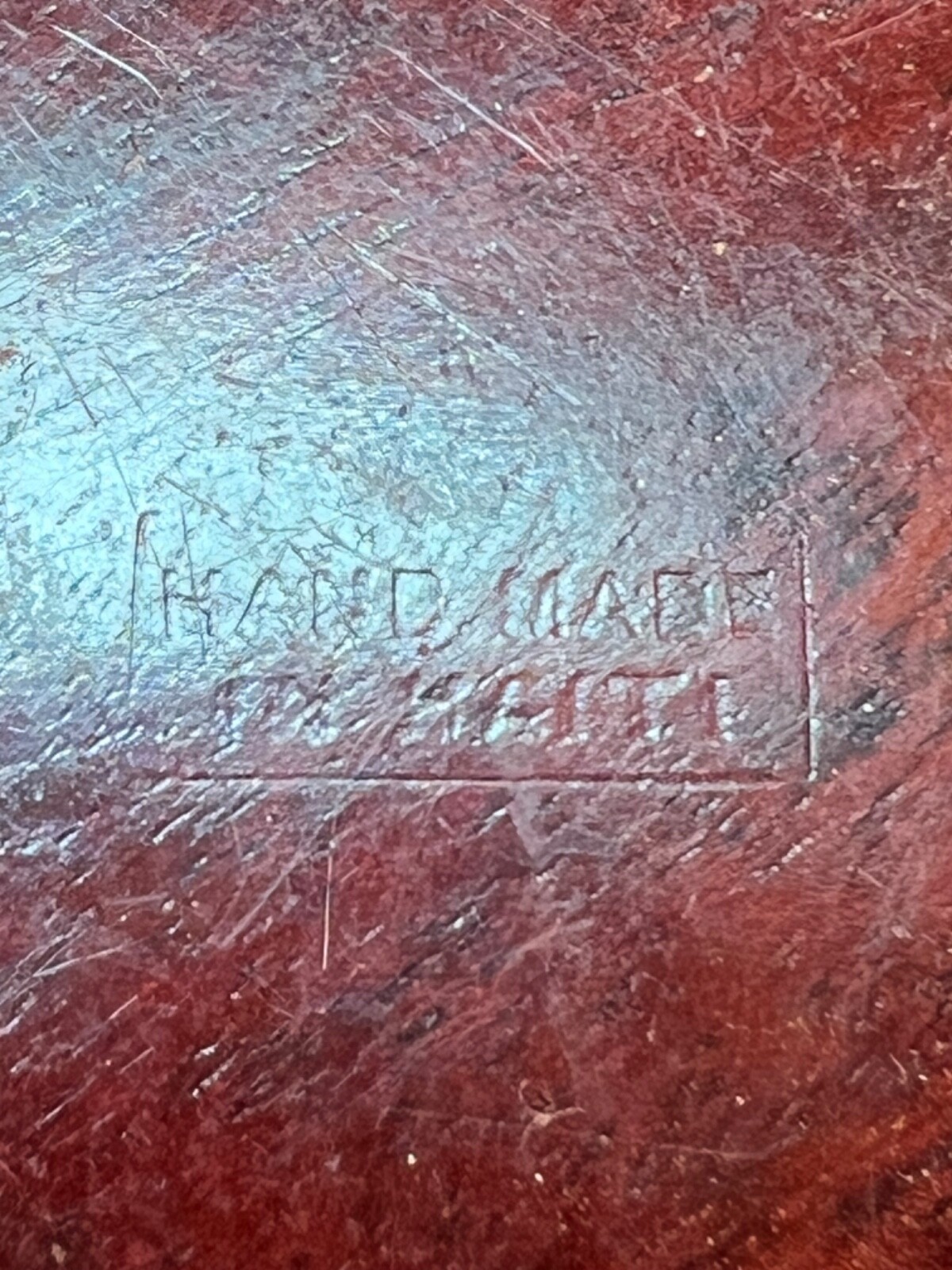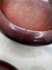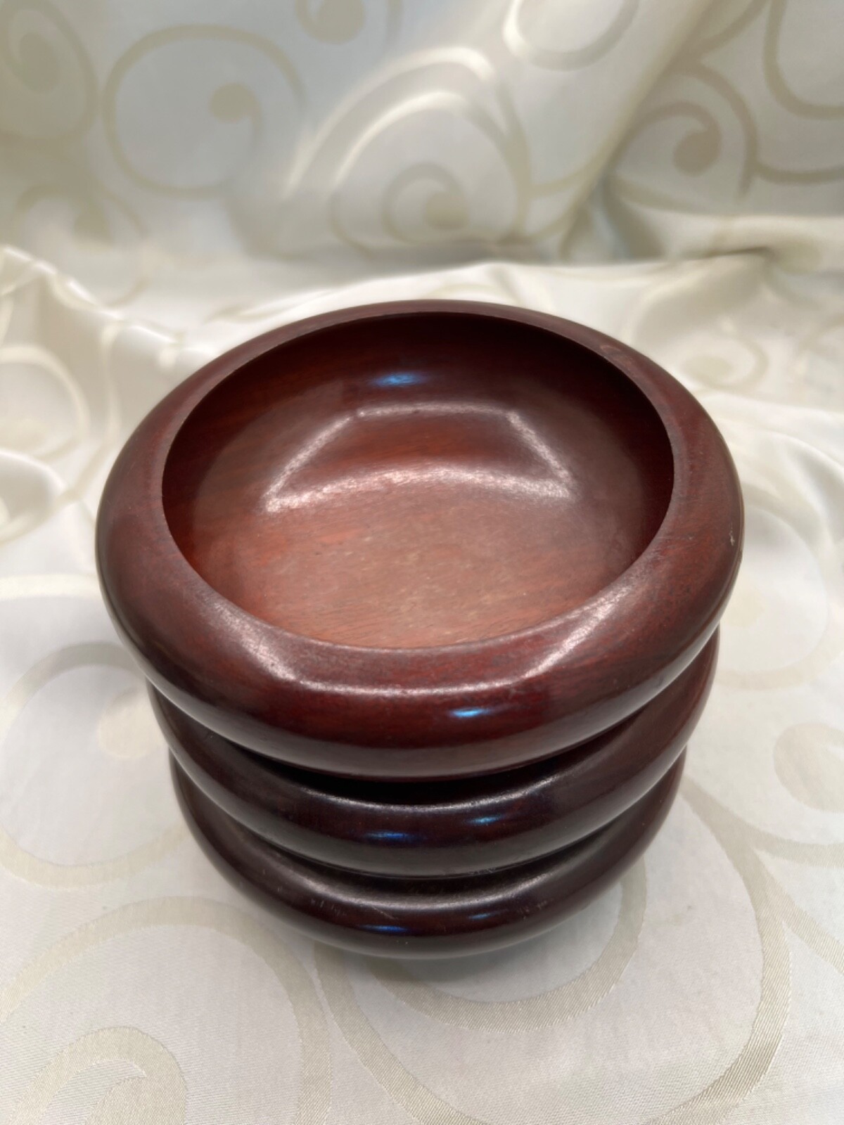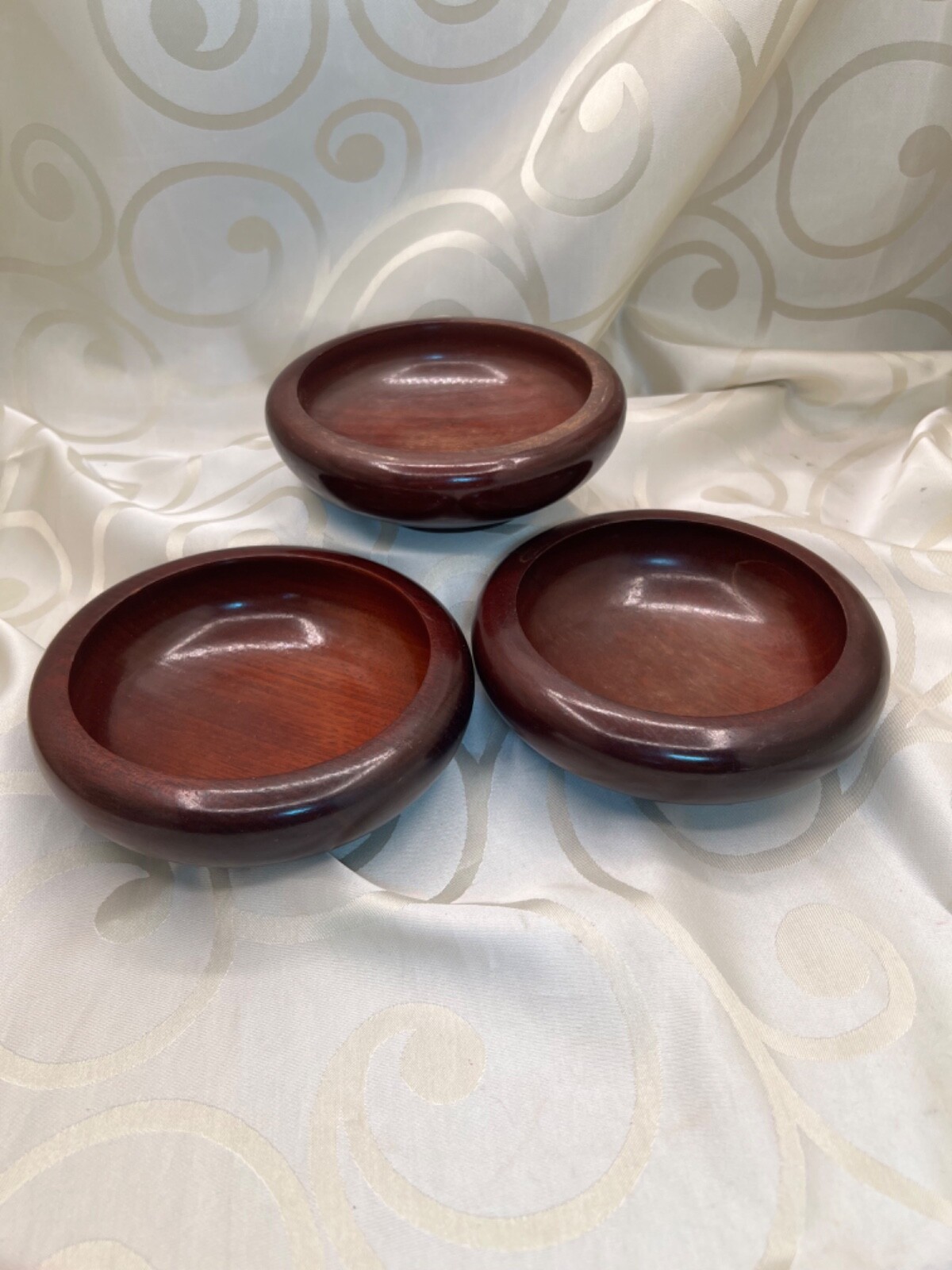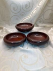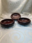 The Vintage MCM Turned Mahogany Wood Bowls Set includes 3 round bowls handcrafted in Haiti. Each bowl has a wood grain pattern, a polished finish, and measures 6 inches in diameter. Made of wood, these Mid-Century Modern style bowls have a depth of 1 1/2 inches and a height of 2 inches. The set includes a total of 3 bowls, perfect for serving or display.