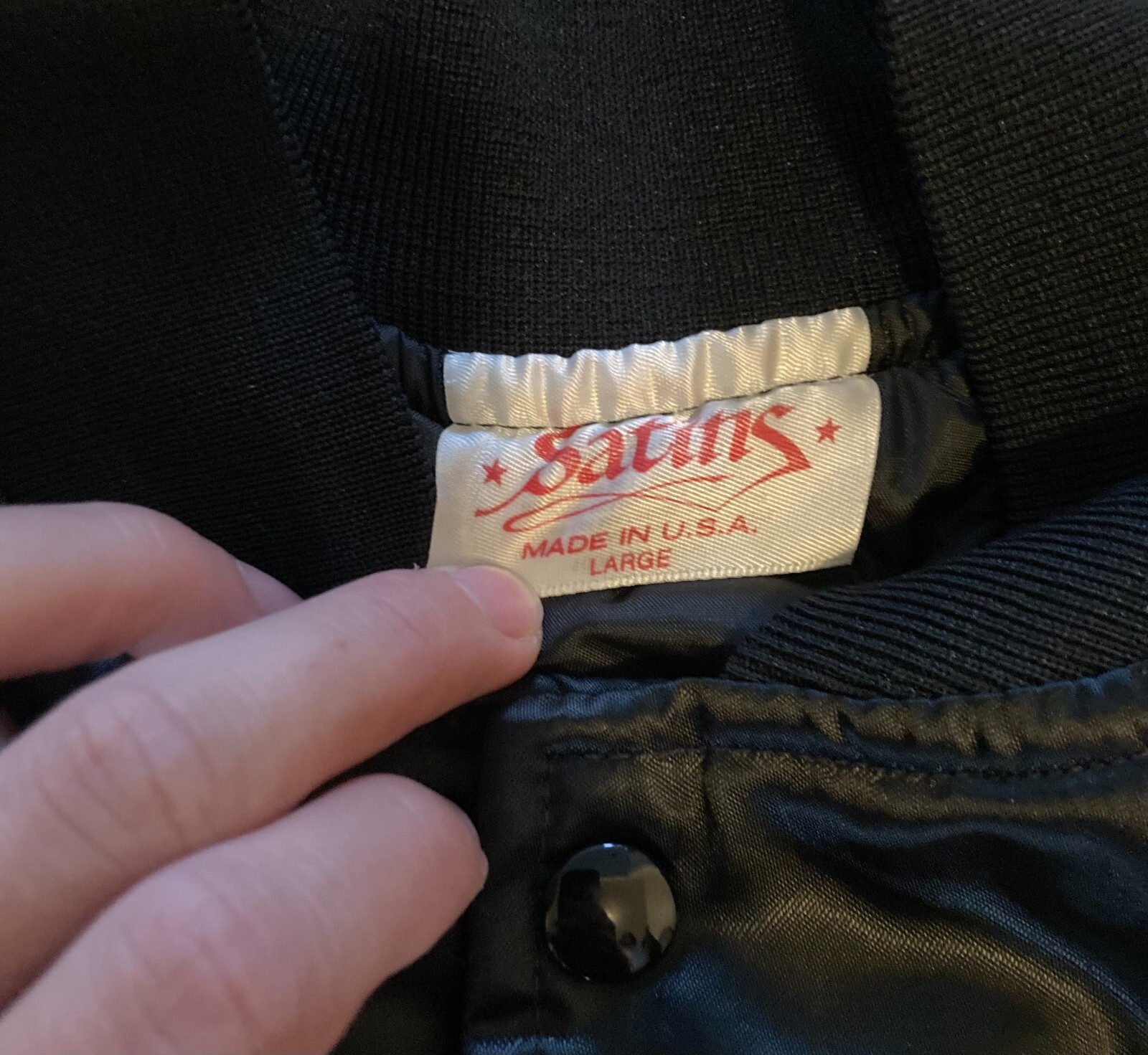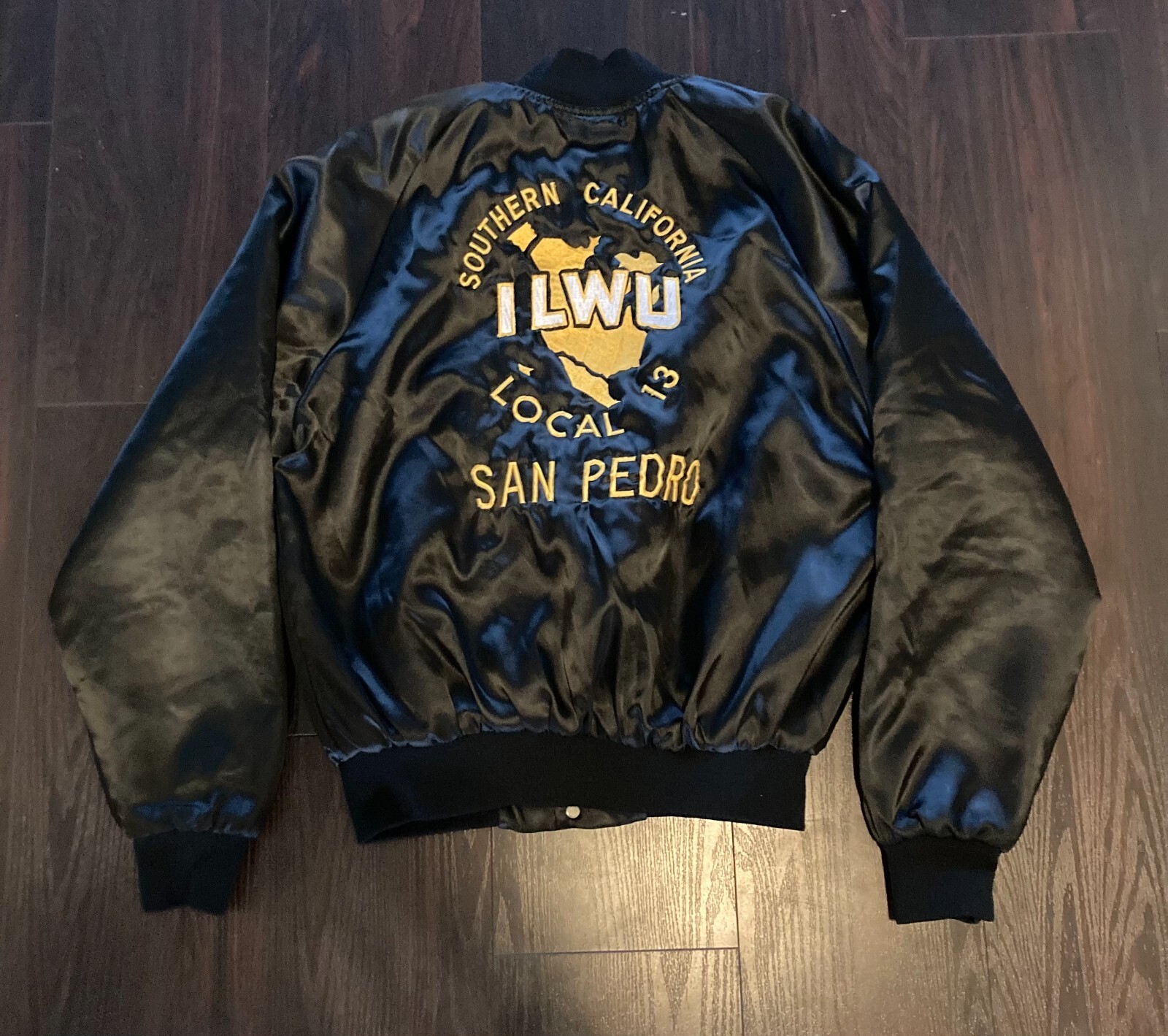 The Vintage Made In USA Black And Gold San Pedro Local Bomber Jacket 24x25.5 is a stylish and unique piece of outerwear for men. Made by Satins in the United States, this jacket features a black color with gold accents, giving it a classic and eye-catching look. The bomber style fits perfectly for the winter, fall, and spring seasons, making it a versatile and fashionable choice for any man's wardrobe. This vintage piece adds a touch of nostalgia and Americana flair to any outfit, making it a standout addition to any collection of men's clothing.