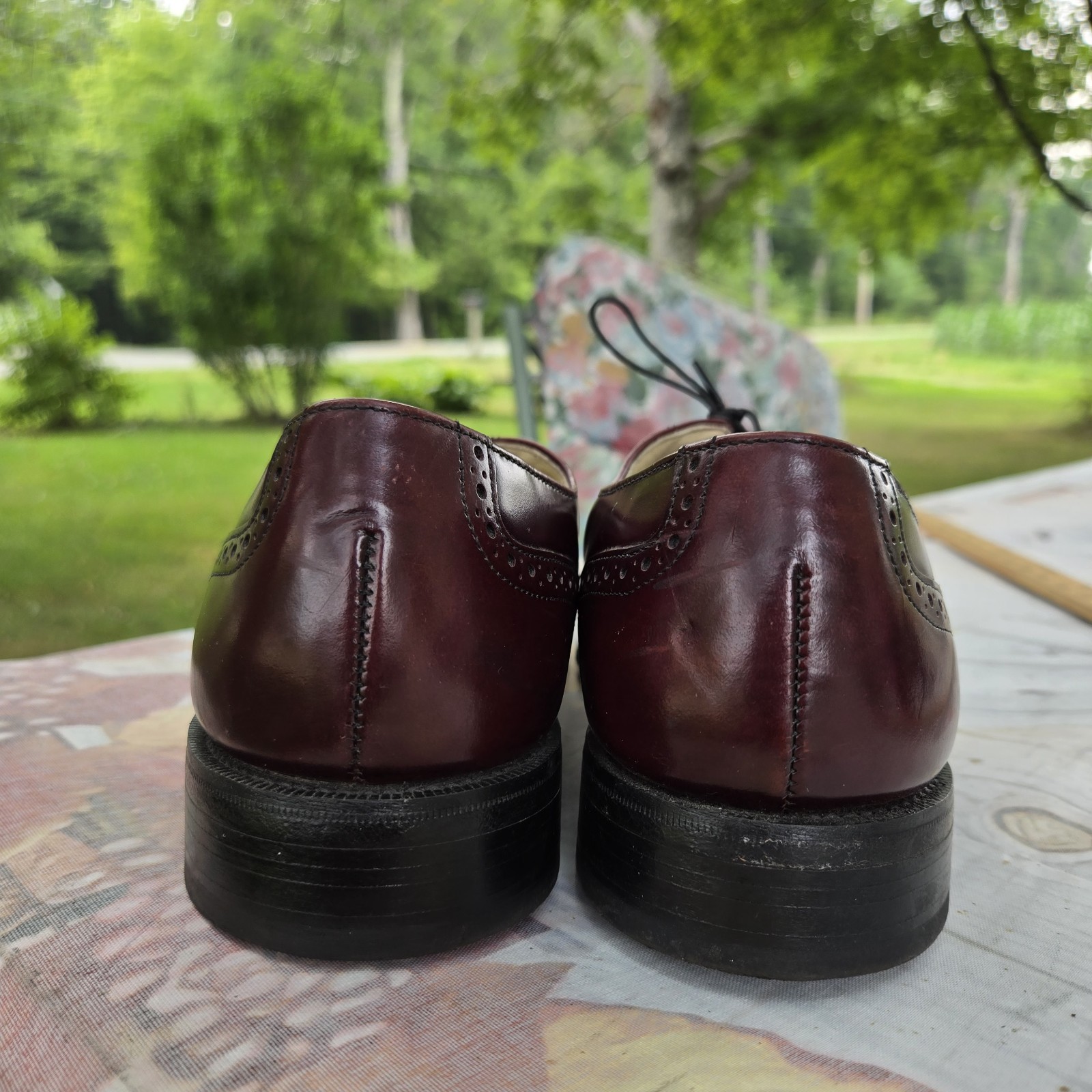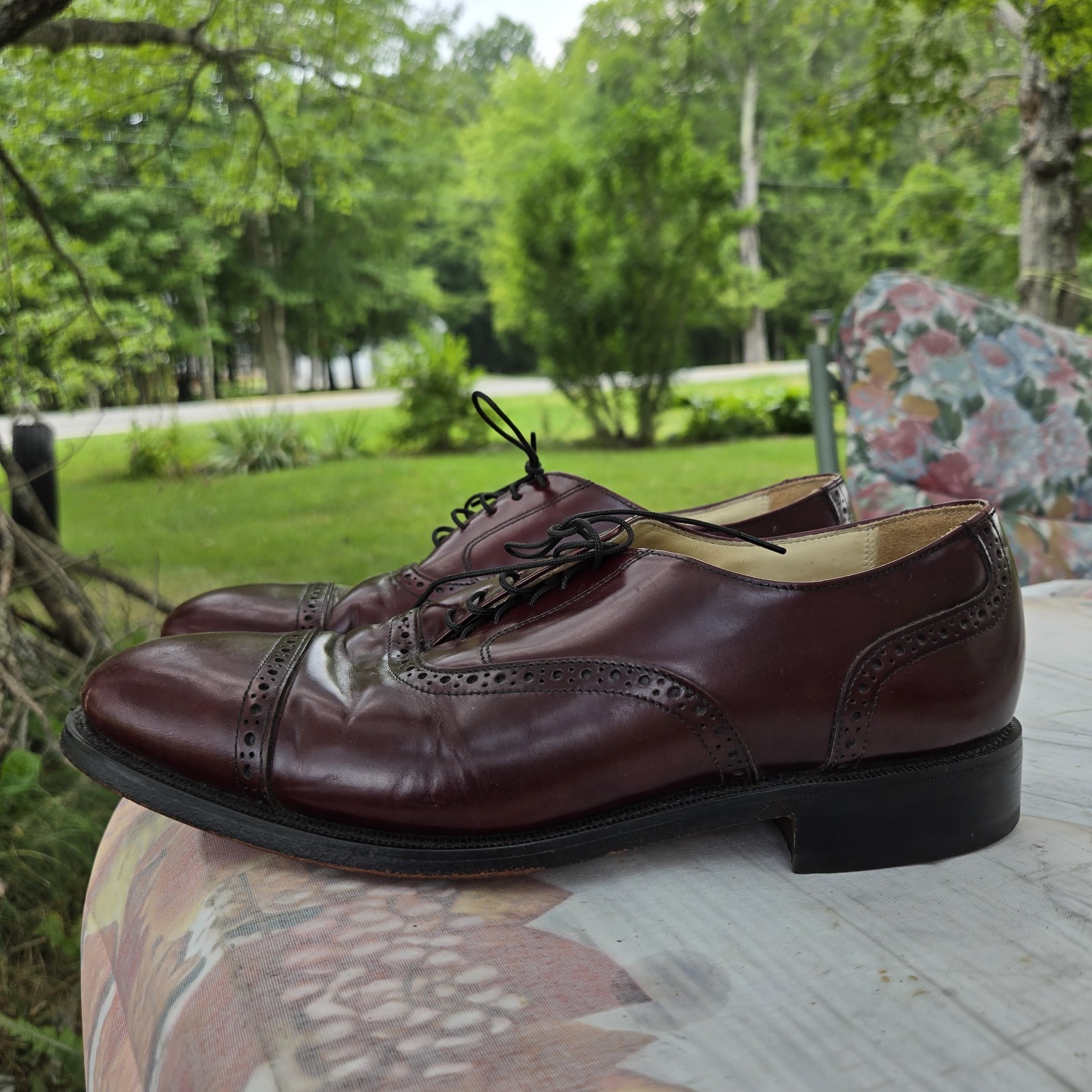 These Vintage Made In USA Bostonian Wing Tips Oxford Shoes are a classic statement piece for any man's wardrobe. Crafted from burgundy leather with an almond toe shape and lace-up closure, they exude a timeless charm and sophistication. Perfect for a dressy occasion or adding a touch of preppy style to a work outfit, these wingtip shoes are sure to make a statement. Made in the USA with high-quality leather materials, they are durable and stylish, embodying the best of American craftsmanship and design.