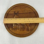This vintage Mahagini carved wood deer plaque is a beautiful addition to any collection. Crafted with care, this plaque features intricate details that showcase the beauty of the deer. The plaque measures 8.5 inches in diameter and is made from high-quality wood. Whether you're a collector of deer-related items or simply looking for a unique piece to add to your home, this plaque is sure to impress. The Mahagini carving is a testament to the skill of the artisan who created it, and the unknown country of origin only adds to its mystique. This handmade plaque is a one-of-a-kind item that is sure to be treasured for years to come.