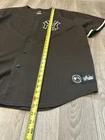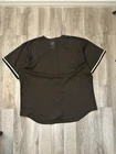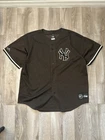 The product is a vintage Majestic New York Yankees jersey in size XXL, made in the USA. It is officially licensed by the Major League Baseball (MLB) and features a blank design in brown color. This jersey is rare and intended for men who are fans of the New York Yankees team. Perfect for baseball enthusiasts looking for a unique and authentic piece of fan apparel to show their support for the team.