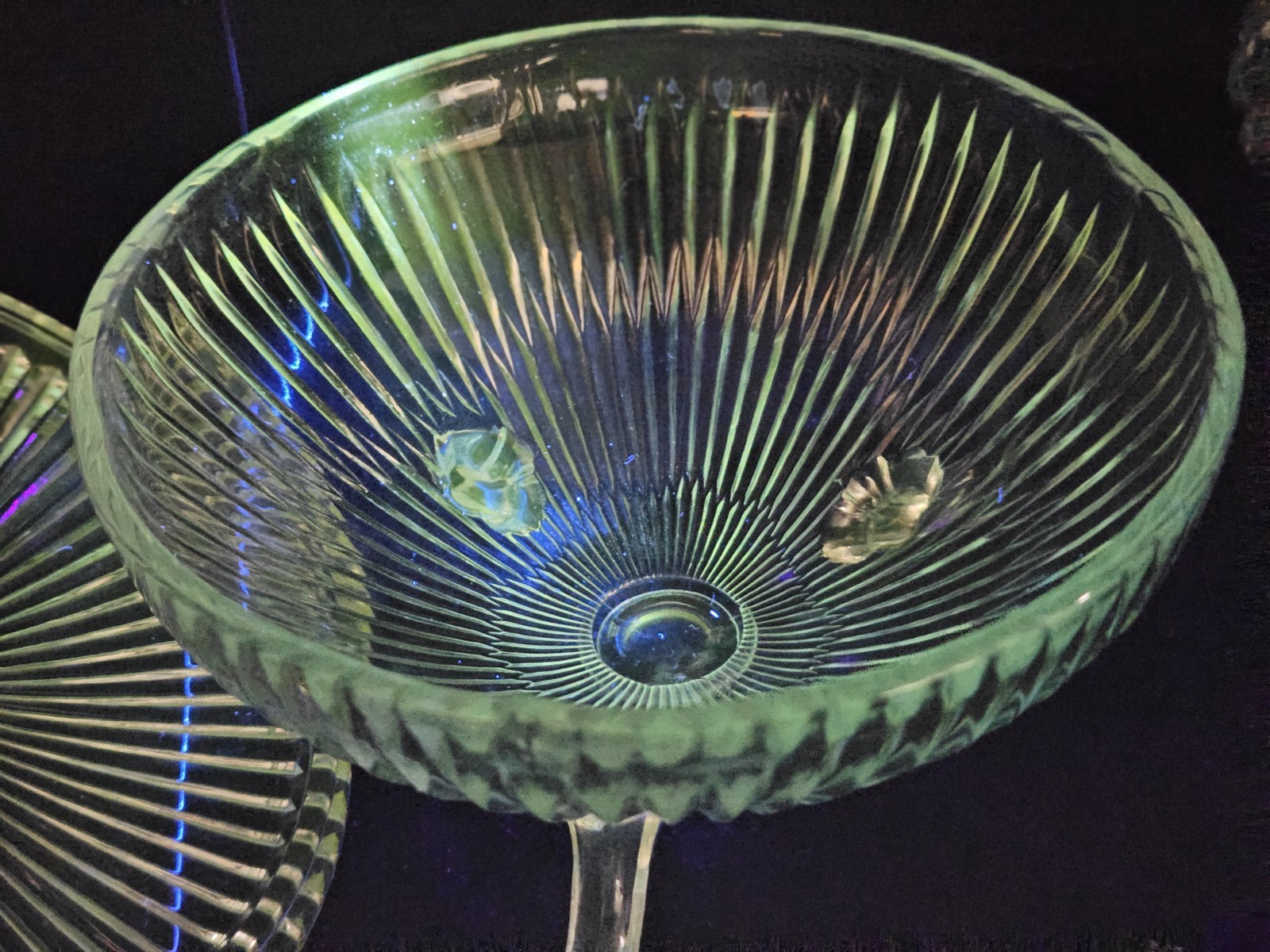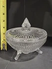 Super cool clear piece that glows under 365 UV. Elevate your home decor with the vintage Jeannette Glass Bowl, an exquisite piece of history from the early 20th century. Crafted between 1930 and 1939, this clear glass bowl showcases the timeless elegance of the Vaseline production style, fused through skilled techniques to create a glowing effect. The bowl stands on three feet, providing a stable display that's perfect for candies or as a striking decorative item. Celebrate every occasion with this original glassware treasure that complements any setting. With its classic pattern and transparent color, this bowl is a testament to the artistic production of the period. It's not handmade, ensuring consistency in quality and design, and is a great addition to any collection or as a standalone piece that brings a touch of the past into your present.