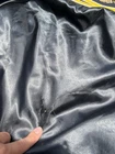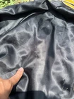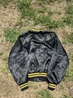 This vintage black bomber jacket is a must-have for any stylish man's wardrobe. Made of durable nylon material, it's perfect for flying or casual wear. The jacket features a classic bomber style with a flight brand logo, and comes in a size L for regular size types. There’s stitching on the back of the jacket as shown.