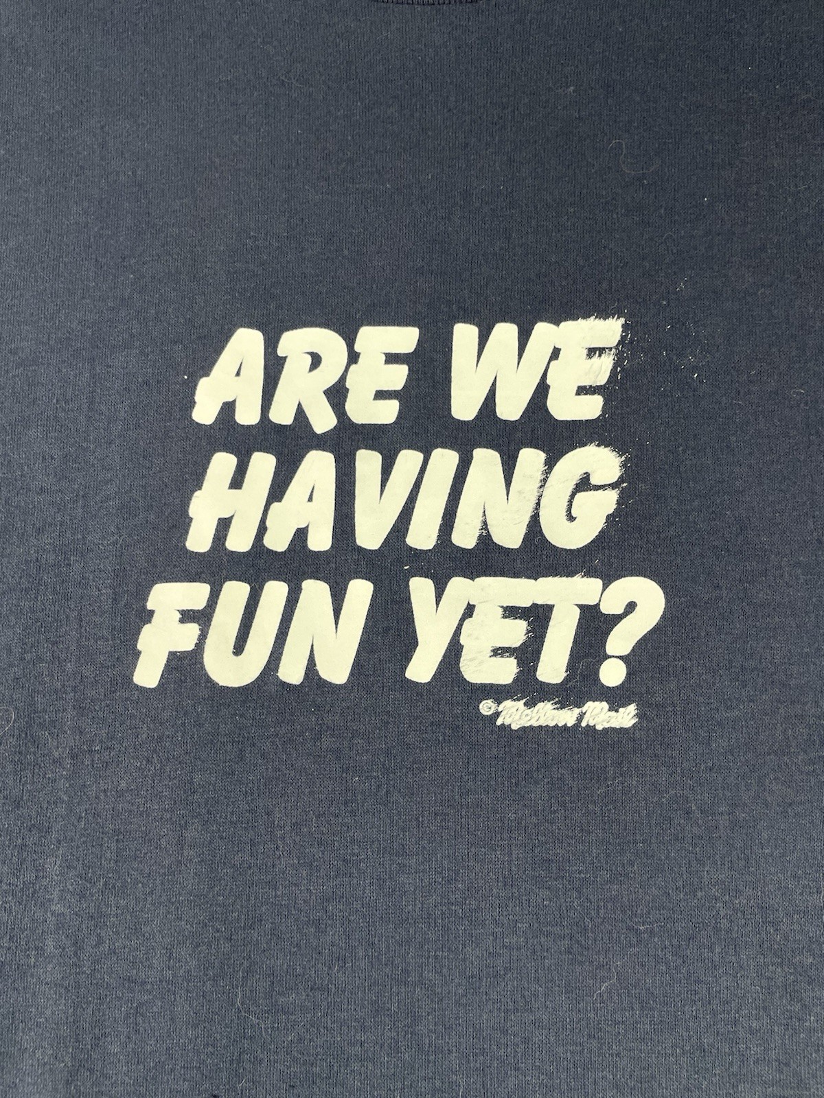 This vintage Mellow Mail t-shirt is a must-have for any fan of classic quote tees. Made in the USA during the 1980s, this navy blue shirt features a solid pattern and short sleeves with a crew neckline. The knit fabric is made of a cotton and polyester blend and is machine washable for easy care. The shirt is a size large and has a regular fit with single stitching accents and a Hit Me logo. Perfect for any season, this t-shirt is a great addition to any vintage collection. Whether you're a collector or just looking for a unique piece, this Mellow Mail t-shirt is sure to impress.