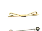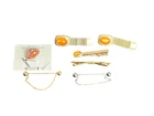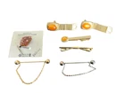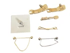 Enhance your style with this vintage 7-piece men's jewelry accessories lot. The set includes a collar bar, tie tack, tie bar, tie clasp, cufflinks and a collar clip. The multicolor pieces are perfect for adding a touch of elegance to your outfit, and the mixed materials and metal provide a unique and stylish look. This late 20th-century (1970-1999) vintage set is perfect for any fashion-forward man looking to add a touch of classic style to their wardrobe. The pieces are in great shape and have been well-maintained, ensuring they will last for years to come. Get ready to impress with this Swank and Estate brand jewelry set.