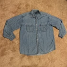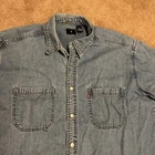 This vintage Levi's denim button-up shirt is a must-have for any casual wardrobe. The long sleeves and metal buttons give it a rugged look that pairs perfectly with jeans or khakis. The denim fabric is durable and has a unique texture that adds to the overall appeal of the shirt. It's sized as a men's large, and the regular fit makes it comfortable to wear all day. The blue color and metal theme give it a classic, timeless look that will never go out of style. Add this Levi's shirt to your collection today!