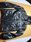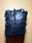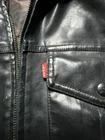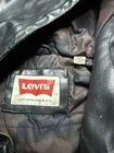 This vintage Levi's jacket for men is a stylish bomber jacket in black polyester with a hood, giving it a biker and 90s vibe. The size is Large and the jacket is designed as a regular fit. It resembles the look of leather and is in amazing condition. Perfect for adding a cool and edgy touch to any outfit, this jacket is a timeless piece that will surely make a statement in any wardrobe. Size Large.