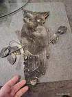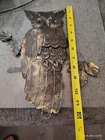 Vintage metal owl wall hanging featuring layered feather details and branch with leaves design. Finished in a dark bronze/black tone with gold highlights. Great mid-century modern or rustic décor piece. This piece shows noticeable vintage wear including paint loss, surface scratches, scuffs, and patina throughout (see photos). Leaf stems show some bending and there is general age-related wear. Structurally solid and displays well with authentic vintage character. Perfect for: • MCM décor • Rustic or cabin décor • Owl collectors • Gallery wall accent Pre-owned vintage condition. Please review all photos carefully for condition details. vintage owl, metal owl wall art, mid century wall decor, gold black wall hanging, retro owl decor, 1960s 1970s decor, rustic metal art, Hollywood Regency style, farmhouse wall decor