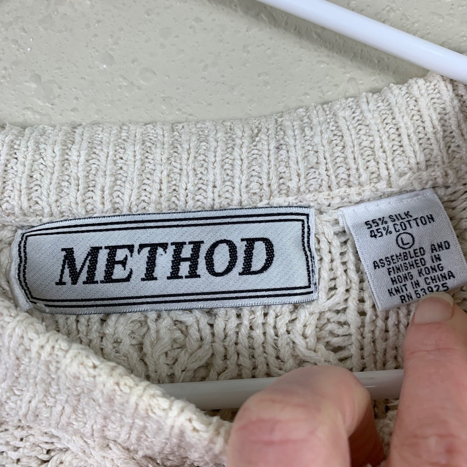 Vintage Method Silk Blend Cable Knit Grandpa Sweater Large Retro Excellent preowned condition! This vintage Method sweater features long sleeves and an all-over cable knit design in a soft silk blend. The classic crewneck silhouette is finished with ribbed trims at the hem, cuffs, and collar. Plush yet lightweight, it combines textural interest with elevated comfort—perfect for switching from retro prep to cozy layering in cooler seasons. Long sleeves Silk blend All over cable knit detail Ribbing on hem, collar, and cuffs Shoulder: 20" P2P: 23" Sleeve: 28" Length: 27" Measurements are lying flat, and estimates only. 1P40 37-7654 1 lb 12 oz Tags: cottagecore, coastal, preppy, casual, neutral