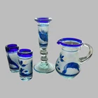Add a touch of vintage style to your kitchen with this stunning four-piece glassware set. Featuring a beautifully hand-painted bird pattern in blue and frosted glass, this set includes a mini pitcher, two glasses, and a candlestick. Made of high-quality glass and crafted in Mexico, this set is both functional and decorative. Perfect for entertaining or as a thoughtful gift, this set is sure to impress. The mini pitcher and glasses are the perfect size for cordials or cocktails, while the candlestick adds a cozy touch to any table setting. With measurements included in the photos, you can be sure that this set will fit perfectly into your home décor.