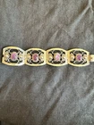 The Vintage Mexico Sterling Silver Bracelet by Plateria GIL is a unique and handmade piece of fine jewelry. Crafted in Mexico, this original link style bracelet features a bezel setting and is signed by the brand. Made with 925 sterling silver, this bracelet showcases a purple stone creation and is perfect for anyone looking for a beautiful and vintage accessory to add to their collection. With its intricate design and craftsmanship, this bracelet is a timeless piece that is sure to make a statement.