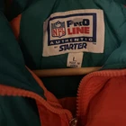 This is a vintage NFL Miami Dolphins Starter Pro Line puffer jacket in size Large with a hood. It is officially licensed fan apparel for supporters of the Miami Dolphins in the National Football League (NFL). The jacket features the Starter brand and is designed for football fans looking to show their team pride while staying warm and stylish. No flaws sold as is in pictures