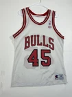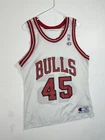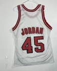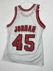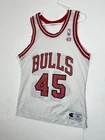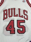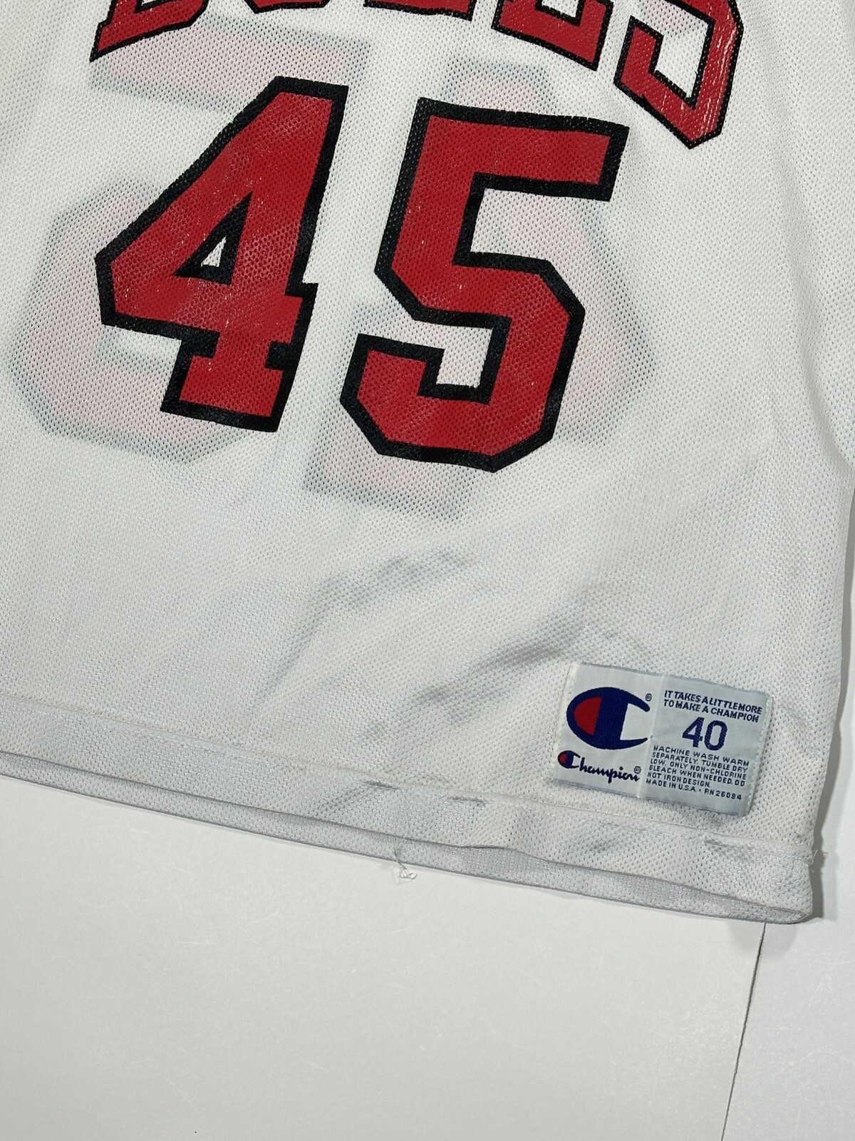 Vintage Michael Jordan Chicago Bulls NBA White Champion #45 Jersey Men’s Size 40 Very decent - to - pretty okay condition overall for vintage jersey - see ALL photos very closely Jersey has moderate - basic normal wear/tear overall - graphic print has some light cracking /stress throughout both sides front and back on numbers /letters - light marks if anything - some light discoloration/fade throughout - see ALL photos very closely for condition of the jersey Will ship with care