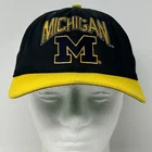Vintage University of Michigan Wolverines Baseball Cap Hat 90s Blue Yellow NCAA UMich UM College The Game Snapback Six Panel Made In USA Will be shipped in a box. Condition: Has spots, wrinkling, staining on the sweatband, and fading. Has been cleaned and sanitized. See photos.