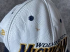 Show your support for the Michigan Wolverines with this vintage white snap-back hat. Made with genuine leather, this hat is perfect for any fan who loves football and wants to represent their team during the regular season and playoffs. The hat features the team's logo on the front and is one size fits all. This hat is a great addition to any fan's collection and is perfect for those who love vintage clothing. Made in the United States, this hat is a great way to show your patriotism while supporting your favorite team. Get your hands on this 90s-era hat today and complete your fan gear!
