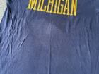 Show off your love for the Michigan Wolverines with this vintage Artex shirt. The blue shirt features a bold spell out of the team's name, perfect for any fan looking to represent during the regular season or playoffs. The shirt is a men's size large and has a classic 70s faded distressed look that any vintage collector would love. Made in the United States, this shirt is a must-have for any true fan of the team and is perfect for any college-NCAA sports memorabilia collection. Whether you're a student, alumni, or just a fan of the sport, this shirt is a great addition to any wardrobe.