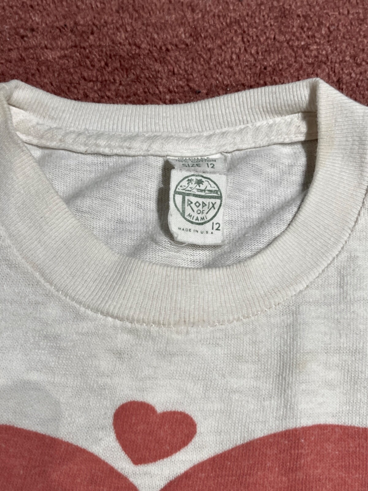 Collectable vintage "Mickey and Minnie Mouse in Love" tee shirt, Youth size 12. Perfect for Valentine's Day!!! The tee shirt shows signs of vintage wear, but is still strikingly colorful, beautiful, and cool. Micky and Minnie are holding hands within a large red heart. They gaze at each other with three small hearts circling around them. Micky wears his traditional red buttoned pants and yellow shoes and Minnie's purple and yellow polka-dot skirt matches her purple shoes. The label is still attached, and Walt Disney Productions is stamped below the main image. Measurements: across chest = 14", top to bottom = 16", sleeve length = 4" This is a truly unique shirt; I did not see the same one anywhere on the internet. This tee shirt was worn by my daughter in the late 1970's and was purchased at Anaheim California's original Disneyland. It was stored away carefully when she outgrew it a long time ago. It's a beautiful purchase for anyone who loves Mickey and Minnie would cherish this vintage tee shirt.