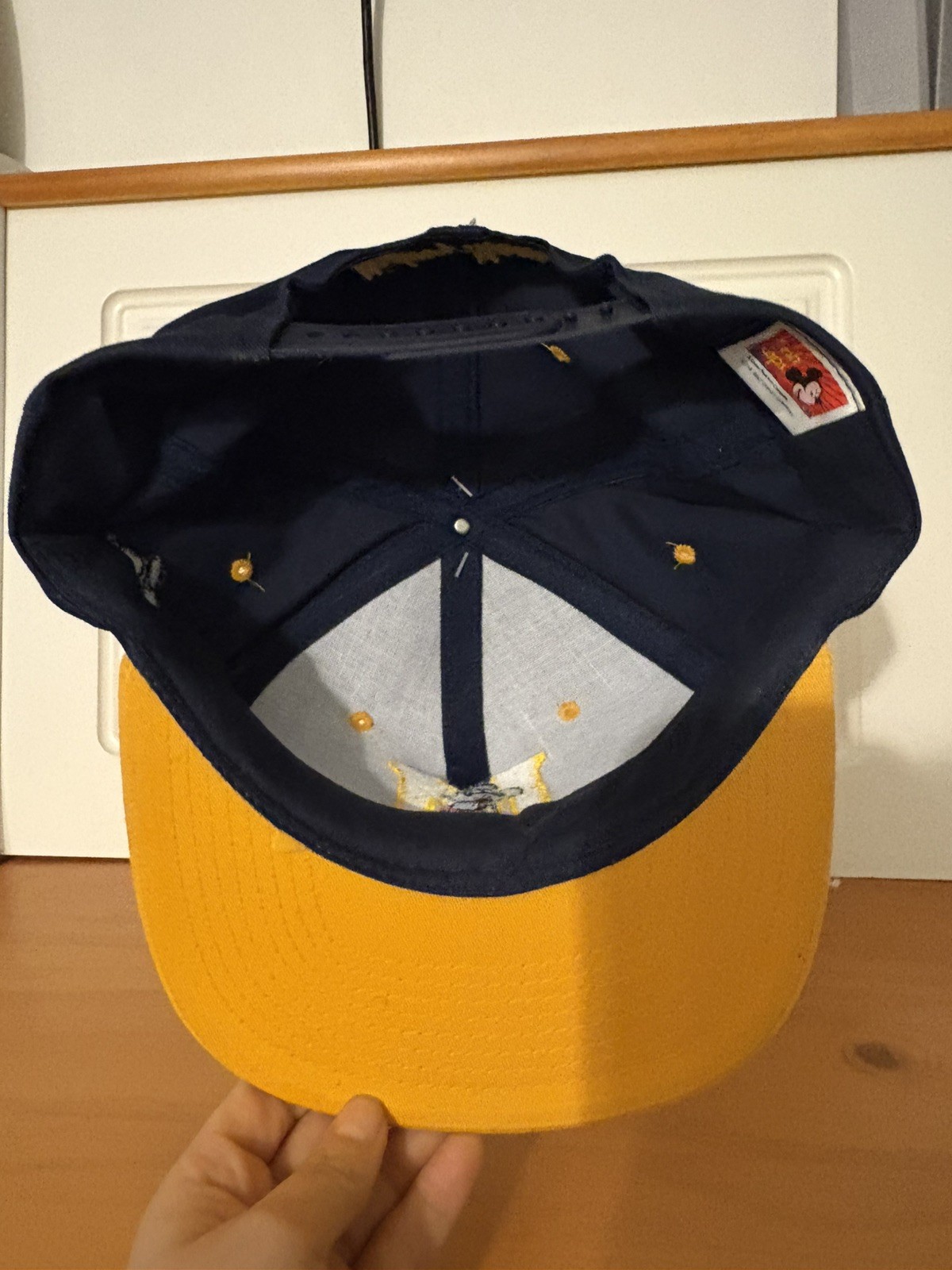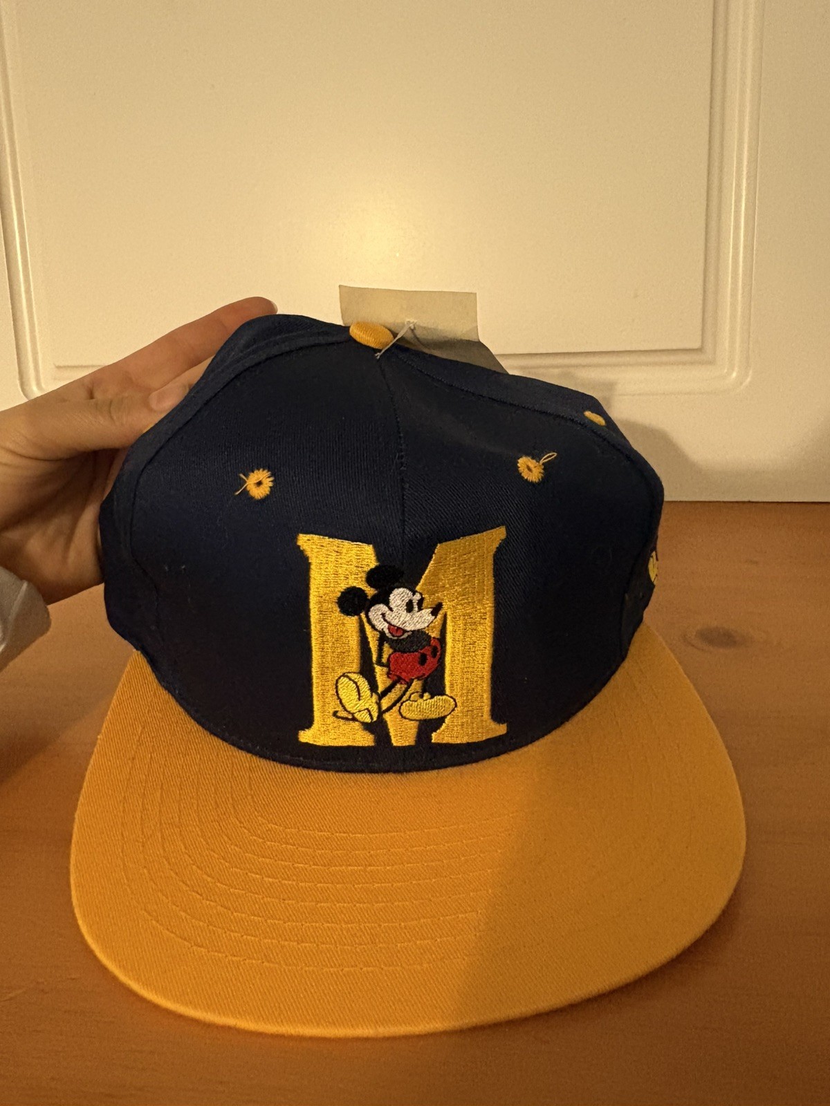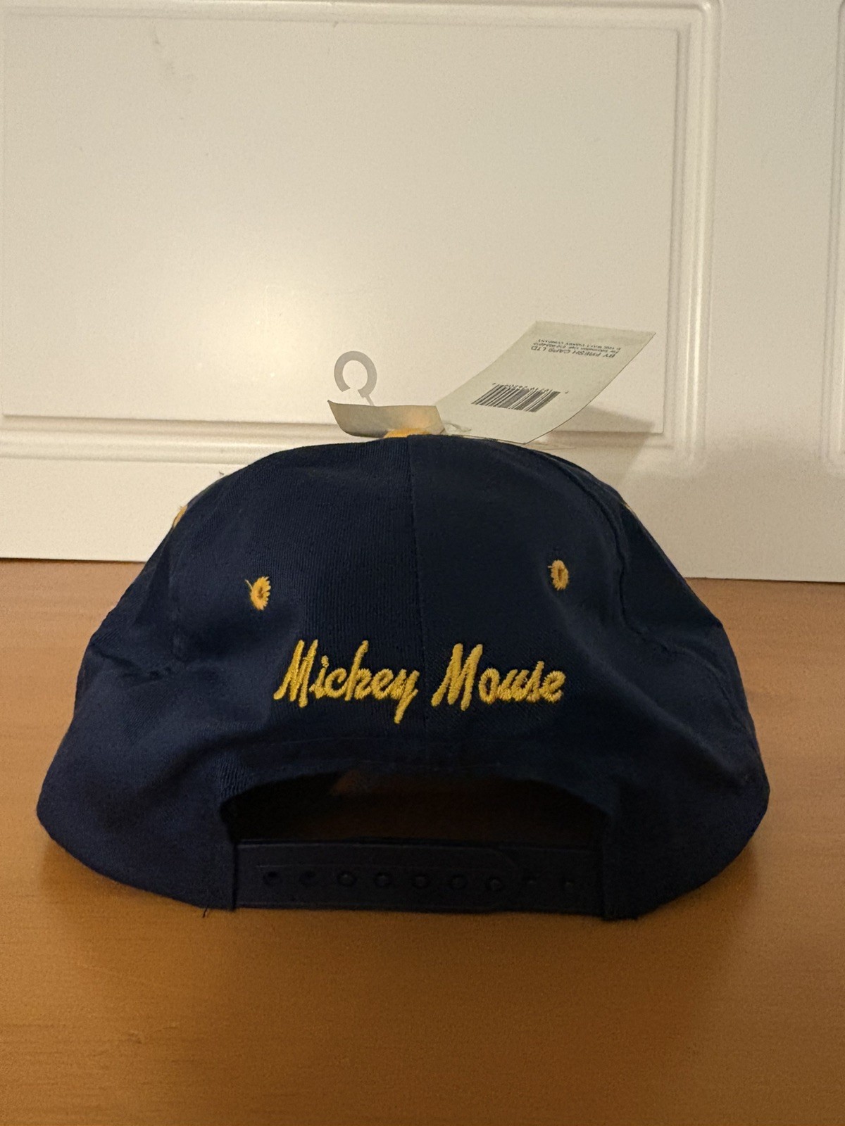 The Vintage Mickey Unlimited 90s Disney Mickey Mouse M Logo Elastic Back Hat Cap in blue features a stripe and solid design with the iconic Mickey Mouse character. Made of cotton twill material, this one-size-fits-all baseball cap is perfect for casual occasions and comes with stretch and adjustable features. The vintage cap from the 90s is ideal for fans of Disney and Mickey Mouse, suitable for wearing in all seasons.