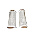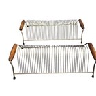 These vintage record racks are a must-have for any mid-century modern collector. Its sleek design and wire holders make it a stylish addition to any room. Manufactured in the 1960s, the exact country or region of manufacture is unknown, but it is clear that these racks are a true piece of history. Not only are they functional for storing and displaying records, but they also add a touch of nostalgia with their retro style. They are not handmade and have not been modified in any way. These collectible items fall under the categories of vintage, retro, and mid-century, making it a unique find for any enthusiast. The wire racks are gold in color and have wooden handles that add to the MCM charm . They each measure 13” long and 6” wide and 3 1/2” tall .