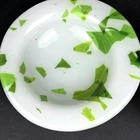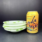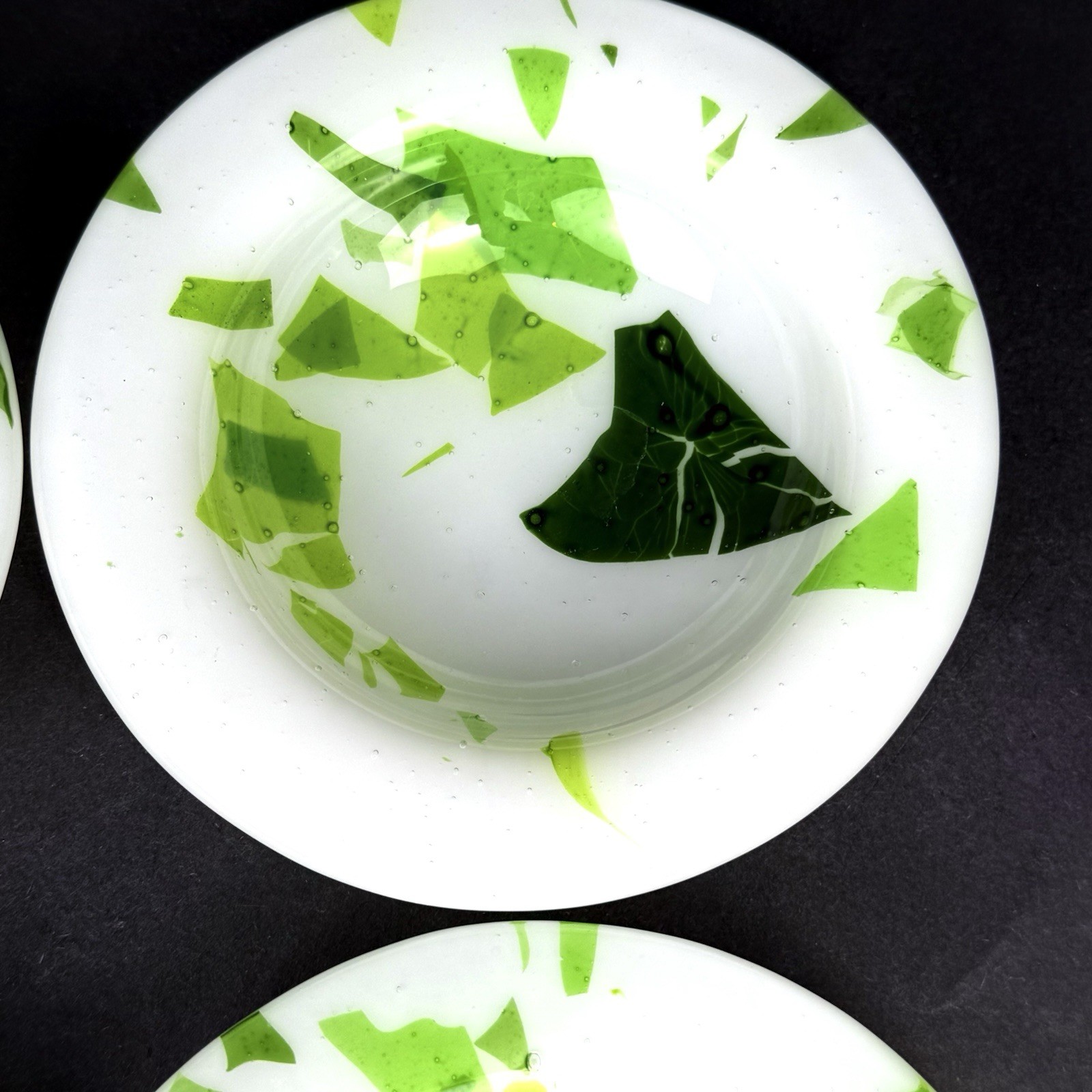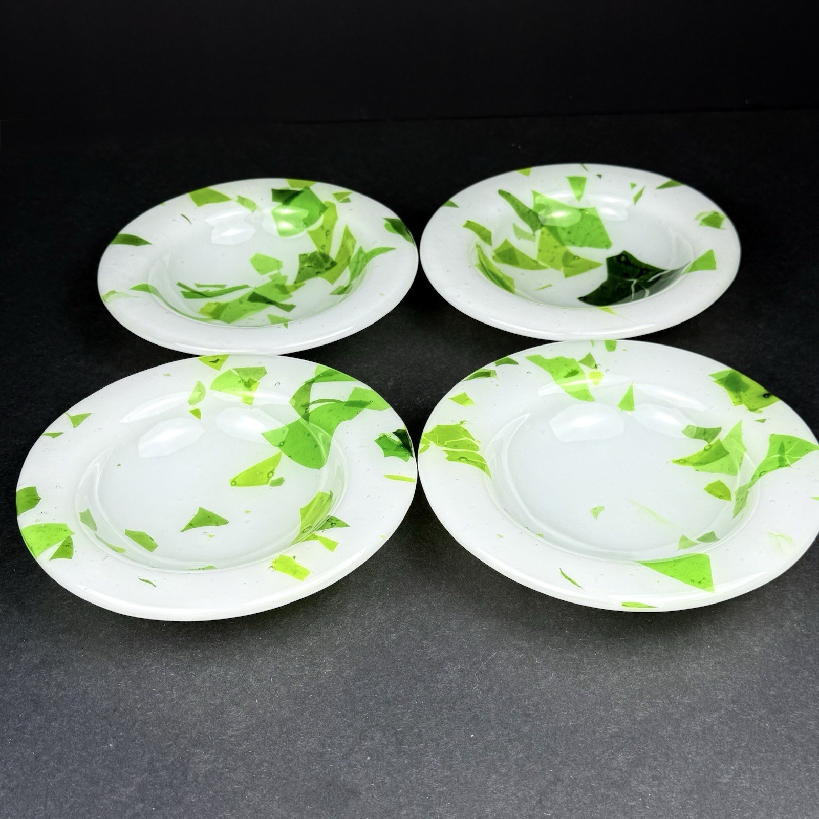 Gorgeous art, glass coupe dessert/berry bowls, white and green. The bowls measure almost 6 inches wide with the 1 inch lip around the bowl. Coupe part is approximately 4 inches. And 1 inch deep. These are amazing works of art with a smooth white bottoms and amazing greens! Set of 4. One of a kind! They also make amazing trinket dishes for gifts! Let me know what questions you have. Blessings to you! πππππ€π€π€π€π€π