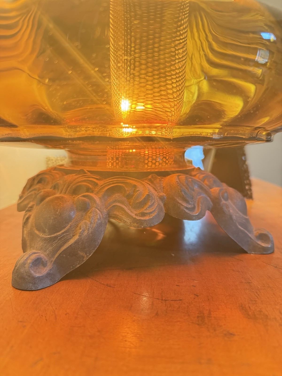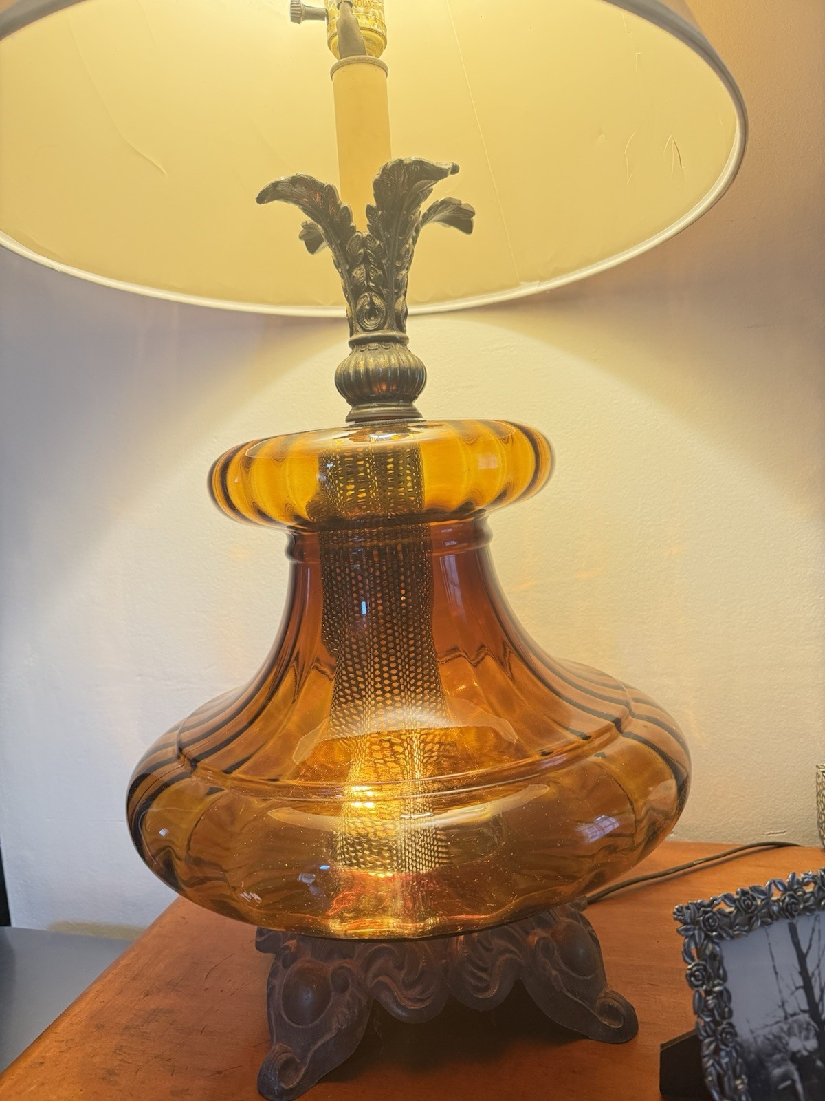 This vintage Mid-Century Modern Falkenstein amber glass 3-way table lamp No chips or cracks. Shipped with care, pick up or meet up within reason.