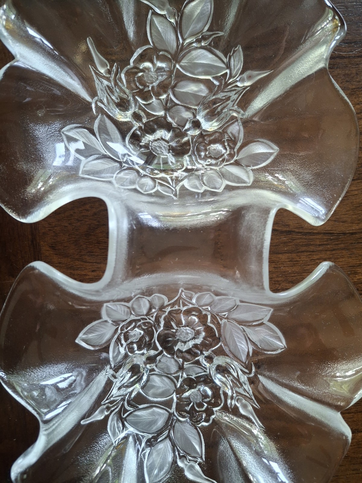 The product is a vintage Mikasa crystal frosted double dogwood rosella candy dish, perfect for adding a touch of elegance to your spring or Easter decor. Made of clear crystal, this candy dish features a beautiful frosted design that will catch the light and make a statement in any room. The double dogwood design adds a touch of charm, making it a perfect piece for displaying candies or potpourri in an elegant and stylish manner.