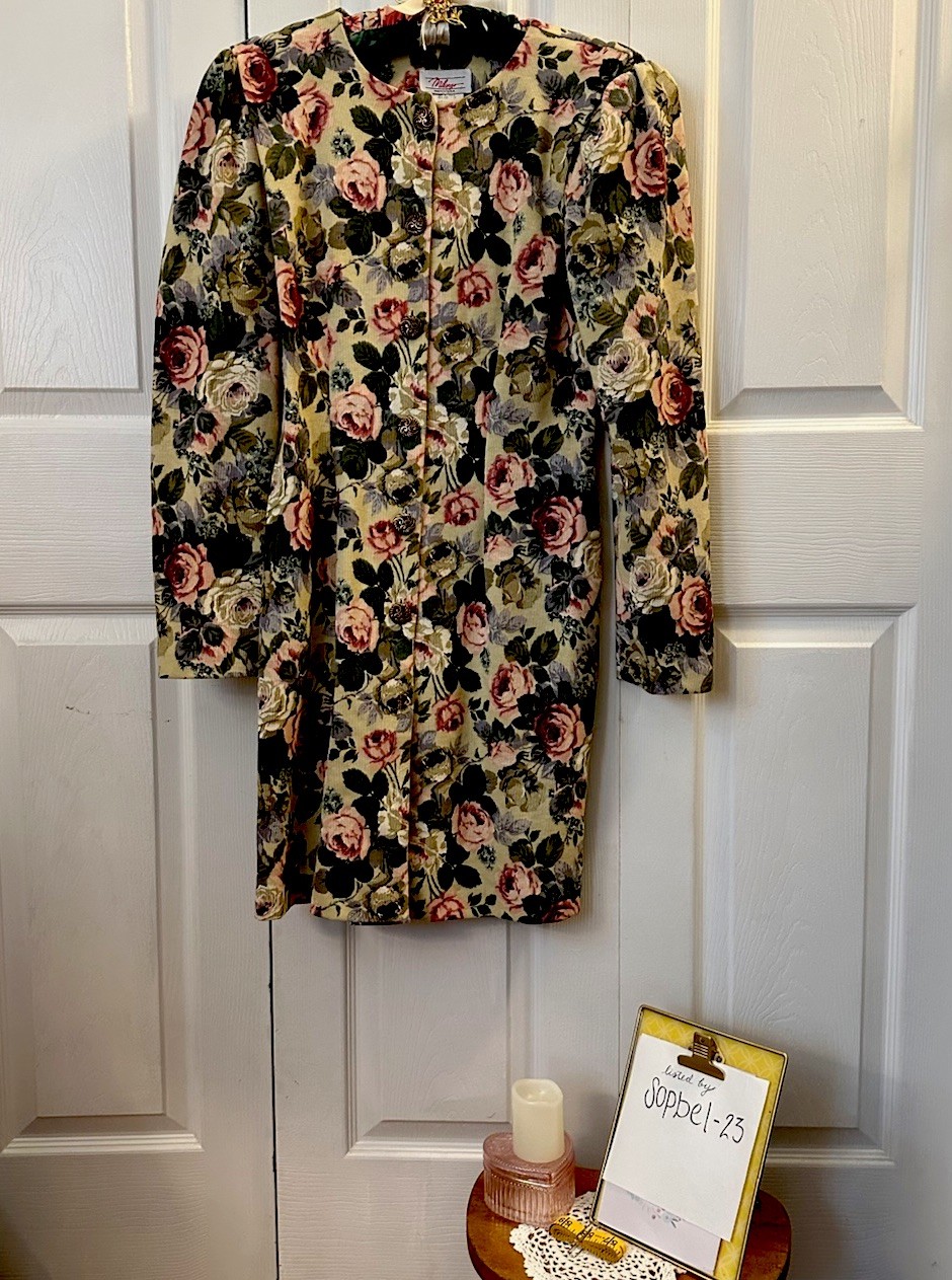 Beautiful brocade overcoat circa late 1980’s early 1990’s with a fabulous brocade pattern featuring roses. MEASUREMENTS: - Shoulder to hem is 34 - accommodates - 28”-30” waist - sleeve length 16” from pit to end