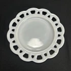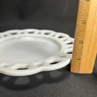 This vintage milk glass lace plate is a beautiful addition to any collection. The round plate measures 8.25 inches in diameter and features a delicate white color with a unique pattern. Made in the United States, this original piece is stackable and decorative, perfect for adding a touch of colonial style to any dining table. The plate is unmarked, but its quality and authenticity are undeniable. Whether you are a collector or simply looking for a unique piece of decorative cookware, this vintage milk glass plate is sure to impress.