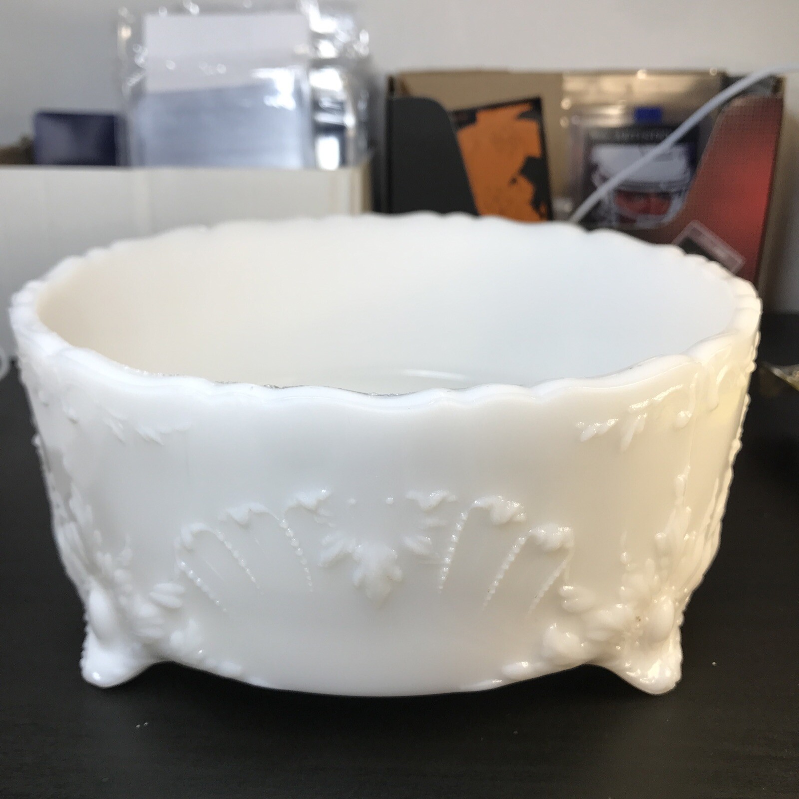 Vintage Milk glass Footed Bowl Has Designs 7.5x3.5 Nice. Condition is Used. Shipped with eBay Standard Envelope for Eligible Items up to $20.