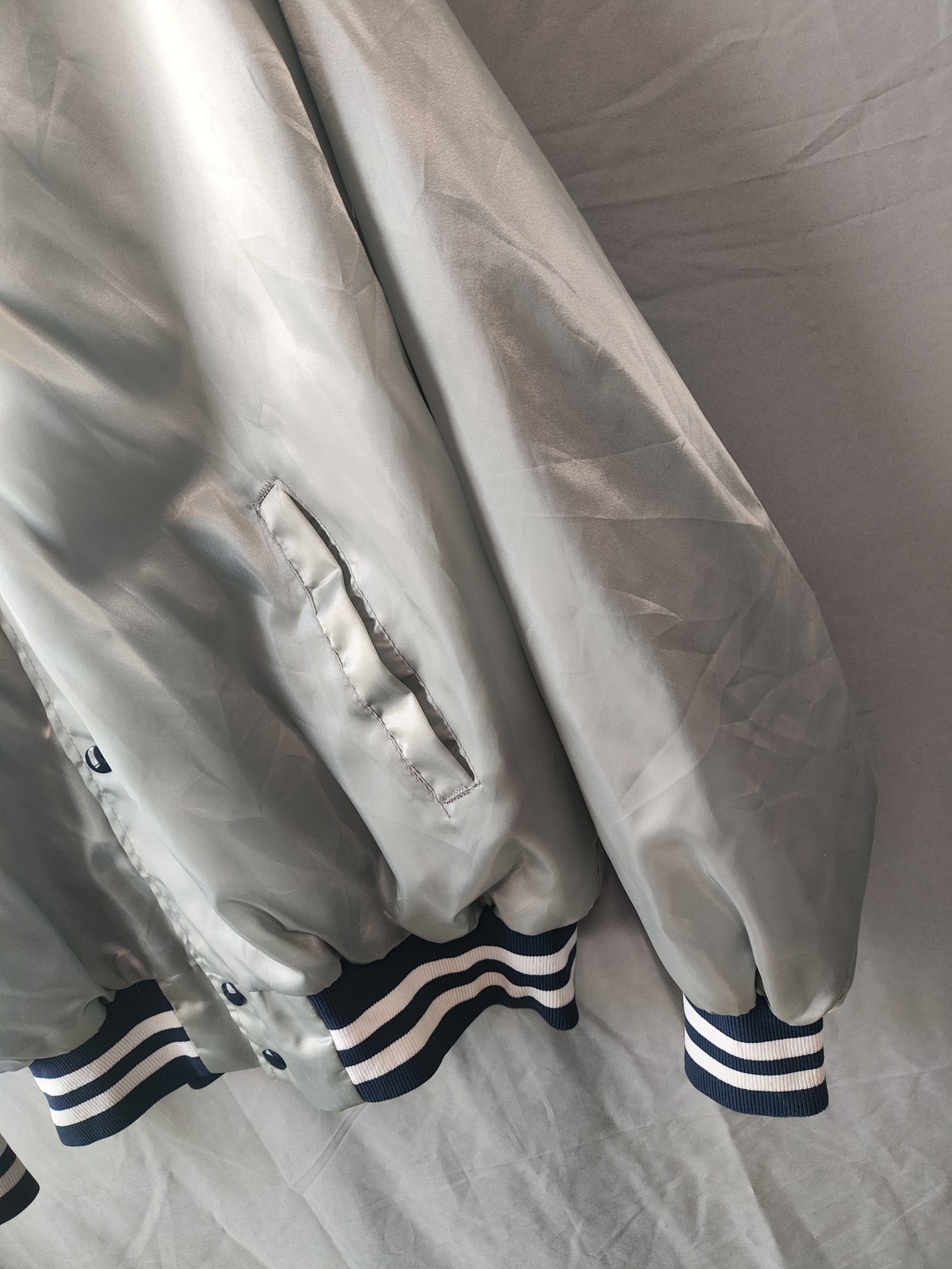 Vintage Miller Lite Jacket Mens Large Silver Blue Satin Bomber Beer Promo 80s USA Condition: Good vintage condition with light overall wear and minor wrinkling from storage. No major stains or tears noted. Please see photos for details. 100% polyester, made in USA (see faded collar tag) Classic Miller Lite "A Fine Pilsner Beer" front chest logo and large Lite Beer graphic on back in blue print Silver satin shell, blue and white striped ribbed knit collar, waistband, and cuffs Snap button front closure, two front hand pockets Bomber/varsity style silhouette with raglan sleeves Estimated size: Large (see measurement photos for reference) Great collectible beer promo jacket, ideal for retro parties, memorabilia display, or everyday vintage wear