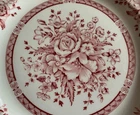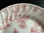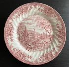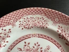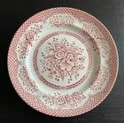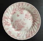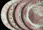Vintage Mismatched Dinner Plates Pink Transferware Set of 4 English Ironstone Churchill Pink Toile - 10 1/8" Johnson Brothers Danube - 10" Wood & Sons Kew Pink - 10 1/4" Churchill The Brook - 10" Items weight 5lb 5oz (without packaging materials) Good pre-owned condition. No cracks, chips or crazing.
